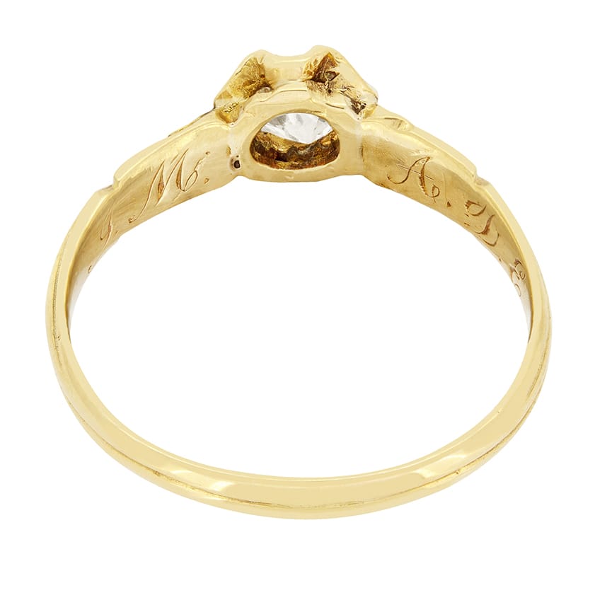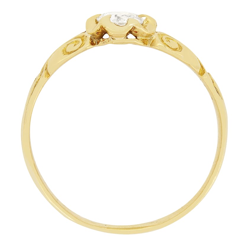 Dating to the 1880s this Victorian solitaire design features a single old cut diamond at it’s centre. The diamond is a 0.40 carat stone of high quality at F in colour and VS2 in clarity. Claw set in 18 carat yellow gold the ring is flanked by beautiful hand carved shoulders and band, synonymous with Victorian era jewellery.