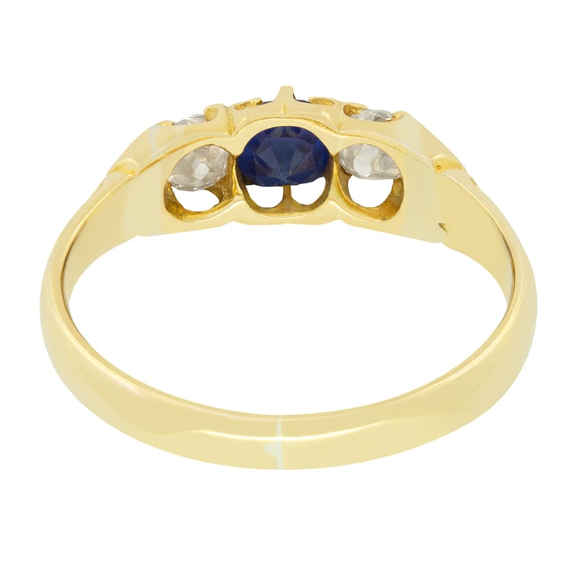 This classic Victorian trilogy ring features a central Sapphire flanked by old cut diamonds. The old cushion cut central stone is a beautiful blue stone weighing 0.40 carat. The accompanying diamonds weigh 0.20 carat a piece and match each other in quality at H in colour and VS1 in clarity. Each stone has been expertly claw set into a ring of 18 carat yellow gold with beautifully carved shoulders flowing down into the band.
