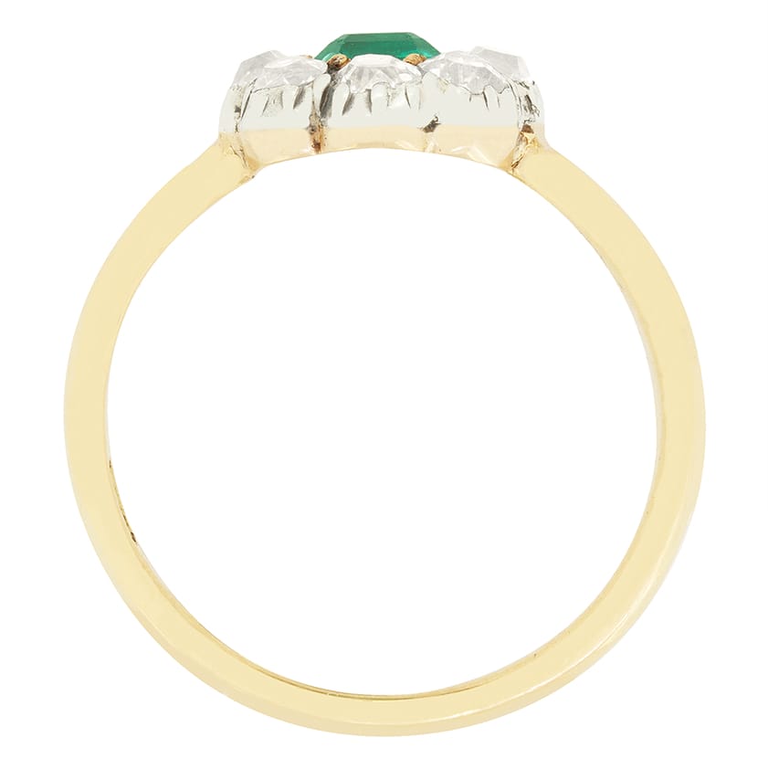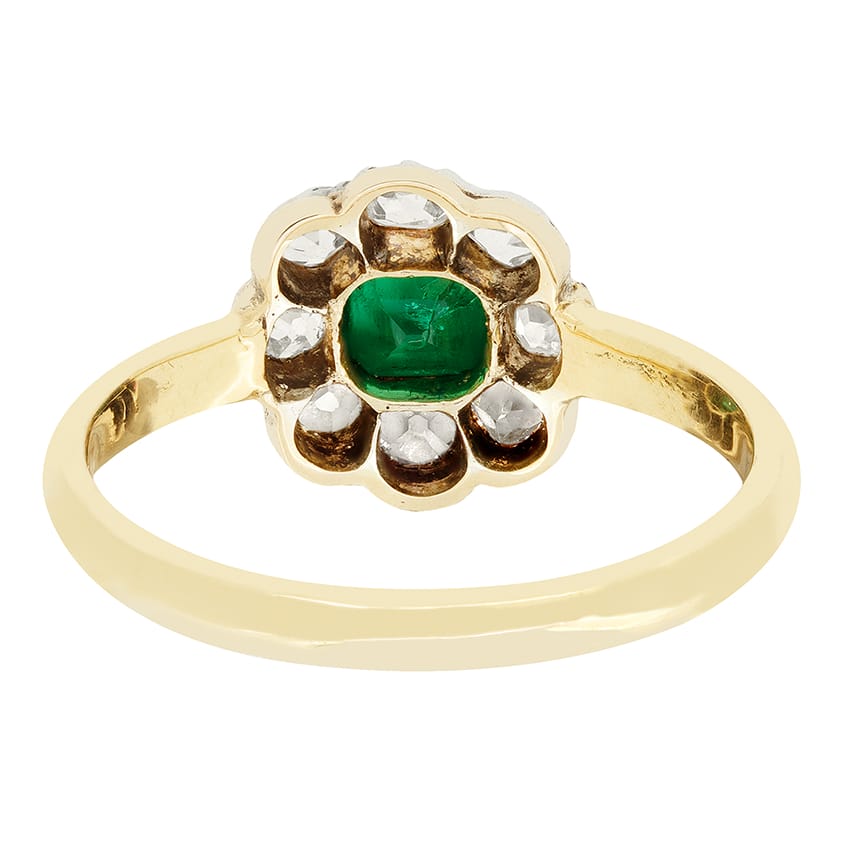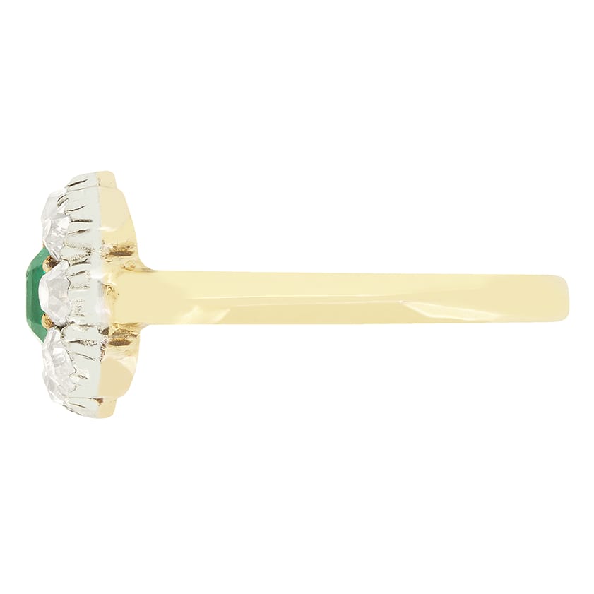 This beautiful cluster ring dates to the Victorian era and centres around a stunning, vivid green emerald. The 0.45 carat emerald is a natural gem of Colombian origin, classically emerald cut, and set within 18 carat yellow gold claws. Enveloping the central stone is a collection of old cut diamonds totalling 0.85 carat. Each diamond ranges from G to H in colour and matches in clarity at VS. Each diamond is delicately set into silver, whilst the contrasting band is crafted in 18 carat yellow gold.