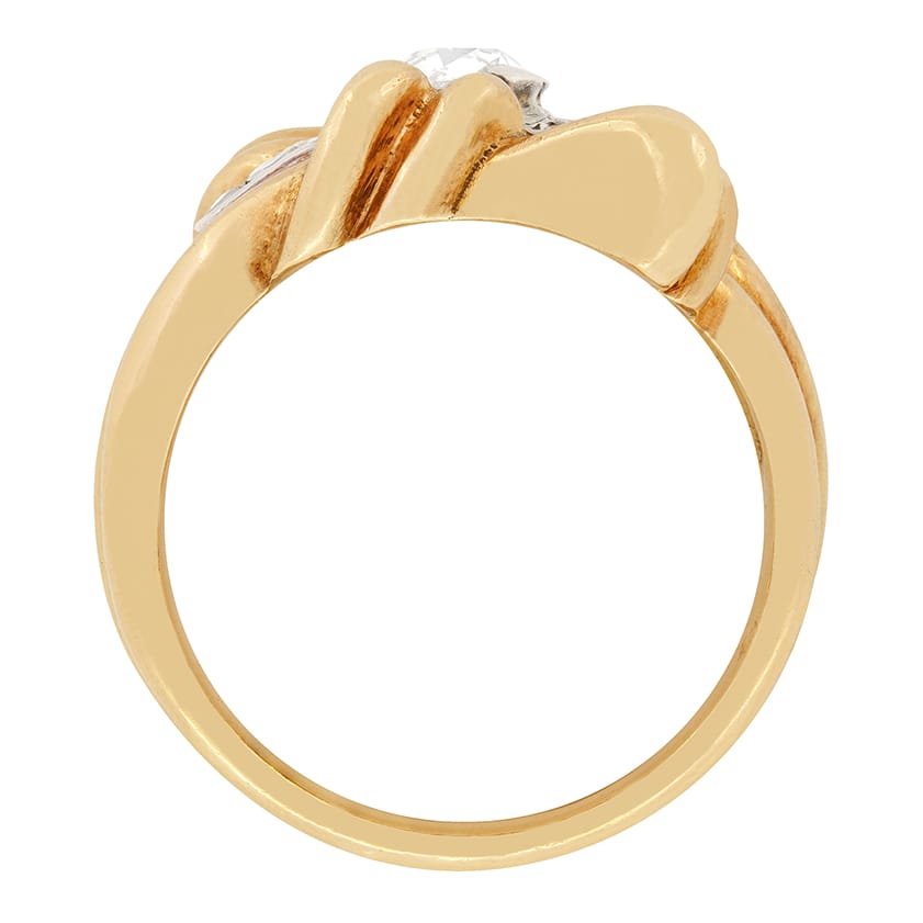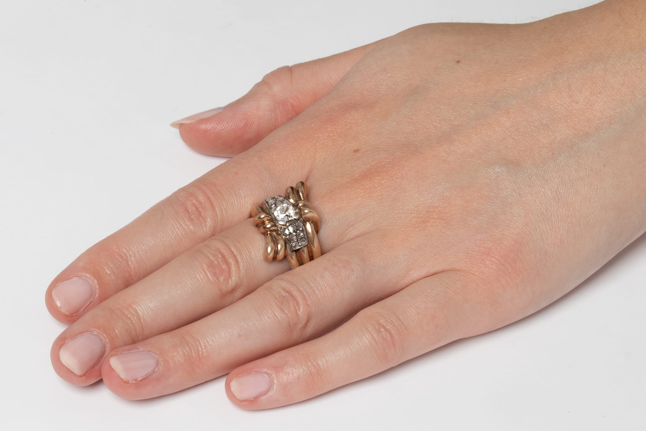 This Victorian ring has been hand crafted in a distinct rope style design from 15 carat rose gold. The centre of the ring houses a 0.50 carat old cut diamond surrounded by 7 rose cut diamonds. The stones have been graded G in colour and SI1 in clarity. Typical of the Victorian era these diamonds have been claw set into silver. This piece is a truly unique cocktail ring from the 1880s.
