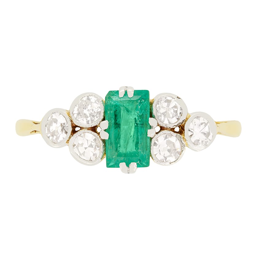 This beautifully crafted Victorian ring features a vibrant 0.50 carat emerald at it’s centre. The green emerald is a baguette cut stone, elegantly claw set. Flanking the emerald are a trio of old cut diamonds on each side. Each stone is 0.10 carat, with matching quality at G in colour and SI in clarity. The stones are beautifully set in platinum, while the ring itself is crafted from 18 carat yellow gold, adding contrast to this classic design.