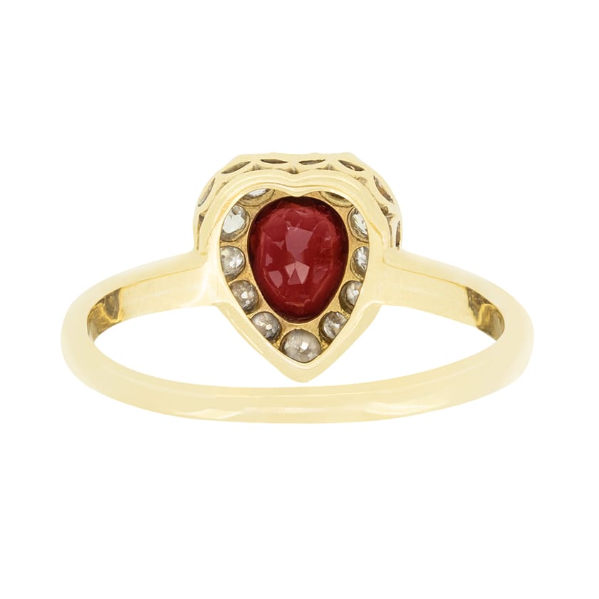 Dating from the Victorian era comes this stunning heart ring. At its centre sits a pear cut, natural ruby. The vivid red stone weighs 0.50 carat and is claw set in 18 carat yellow gold. Encircling the ruby, a cluster of old cut diamonds forms the heart shape. Totalling 0.40 carat, the diamonds match in quality at H in colour and VS in clarity. The ring itself is entirely handcrafted in 18 carat yellow gold in classic Victorian fashion.