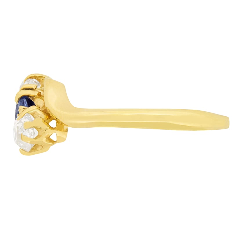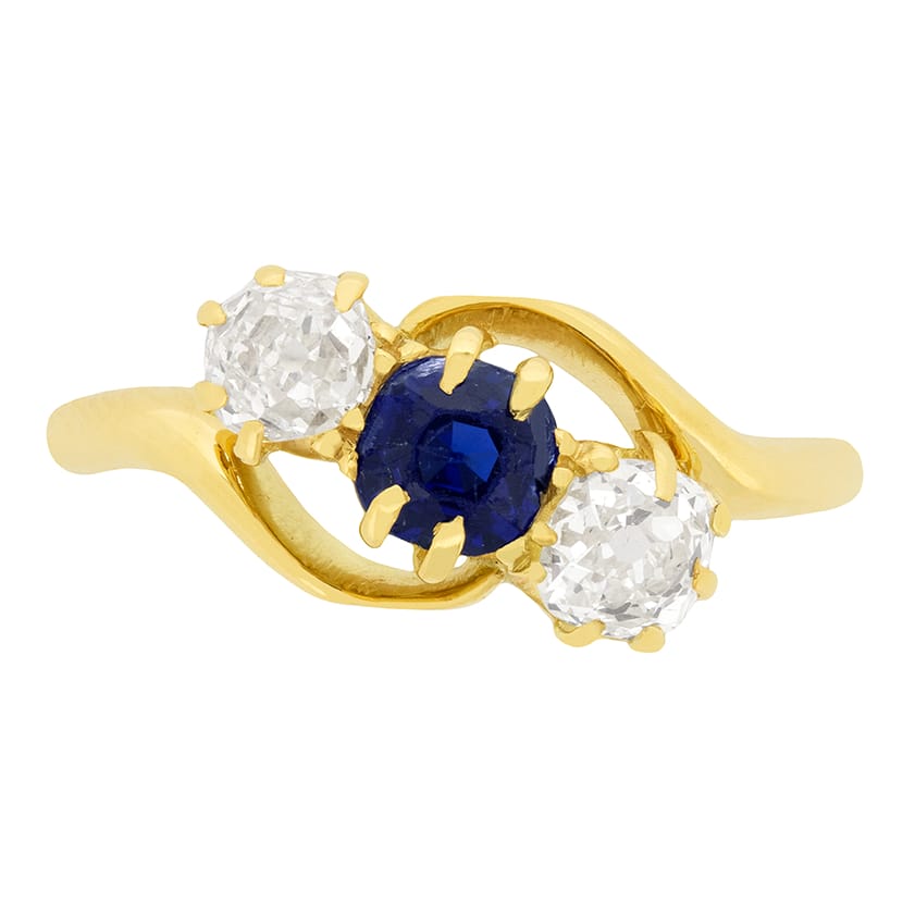Two stunning old cut diamonds accompany the 0.50 carat Sapphire in this exquisite twist ring from the Victorian Era. Both diamonds are 0.30 carats each with a colour of G and a clarity of VS2, with all three stones being claw set. The band shank and claws are all hand crafted from 18 carat yellow gold, beautifully highlighting the deep blue sapphire.
