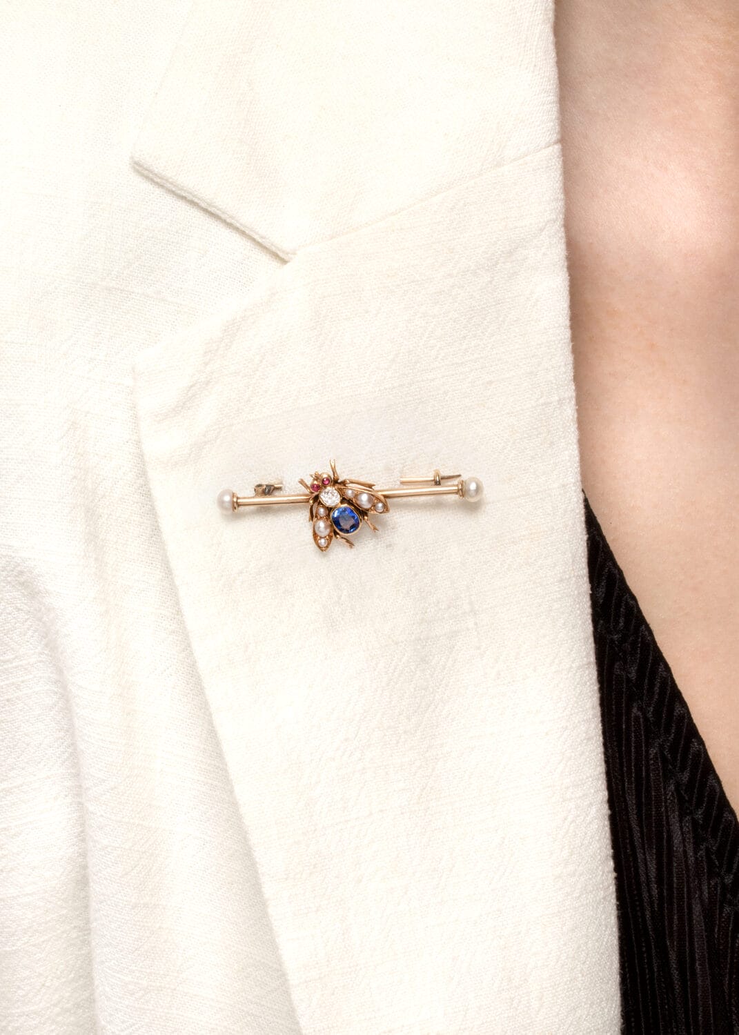 This charming Victorian brooch is crafted in the delightful form of a flying bug. At its centre lies a g 0.50 carat natural sapphire, forming the body, complemented by a sparkling 0.15ct old cut diamond. The diamond has a colour of G and clarity of I1. The wings are adorned with luminous pearls, while two delicate 0.02ct ruby eyes add a vibrant finishing touch. Set in rich 18-carat yellow gold, pearls elegantly cap either end of the pin. This whimsical and beautifully detailed piece, embodies the craftsmanship of the Victorian era.