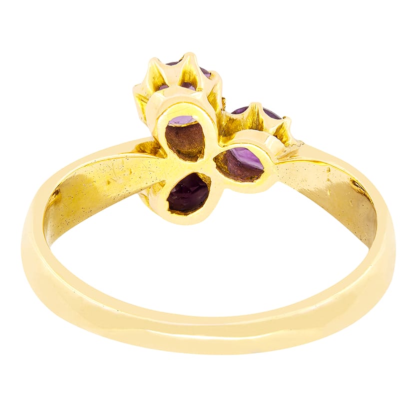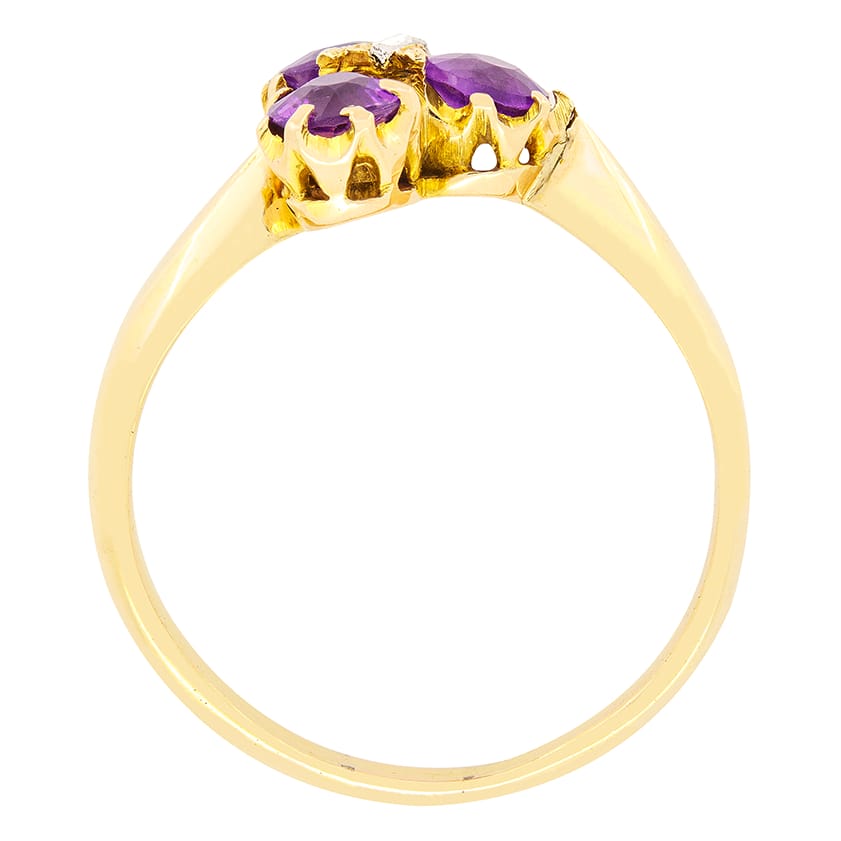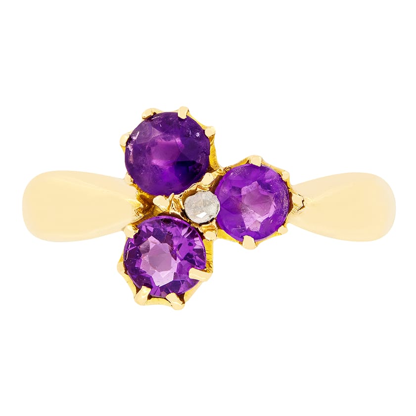 Arranged in a clover pattern a trio of Amethysts take centre stage around a single small diamond in this Victorian ring. Each old cut amethyst weighs 0.20 carat with the rose cut diamond forming the centre of the clover flower. Each stone has been delicately claw set into 18 carat yellow gold to create this delightful hand crafted piece.