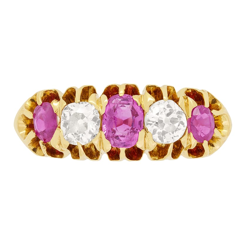This beautiful Victorian five stone ring features a trio of intense pink sapphires, separated by a pair of old cut diamonds. The biggest sapphire sits at the centre weighing 0.30 carat, flanking, the two diamonds are 0.20 carat a piece, with the final two sapphires sitting at each end weighing 0.15 carat each. The diamonds match in quality at G in colour and SI in clarity. Each stone has been claw set into the ring, hand crafted in 18 carat yellow gold with a carved shank design flowing down each shoulder. The original hallmarks are visible on the inside of the band dating this stunning ring to 1897.