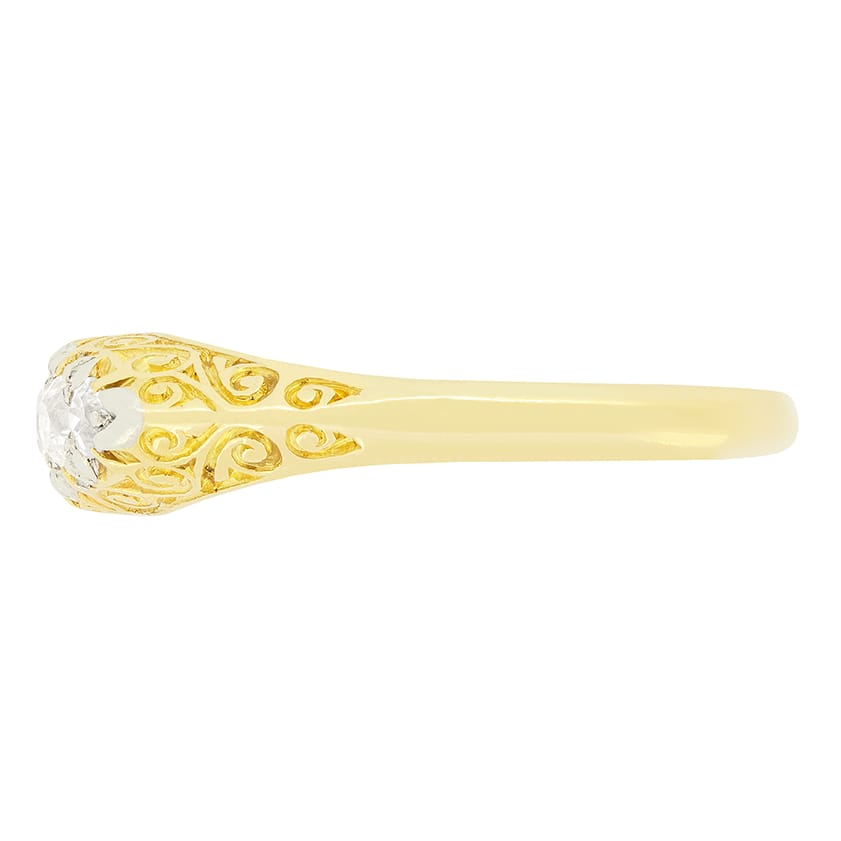 This elegant Victorian ring features five glistening old cut diamonds gentle tapered from the centre out. The largest central diamond is 0.25 carat, with the flanking pair weighing 0.15 carat each and the two end stones are 0.05 carat a piece. All five stones match in quality at G in colour and range in clarity from VS to SI. The ring is expertly hand carved in 18 carat yellow gold with inlayed platinum along the claws enhancing the diamonds shine.