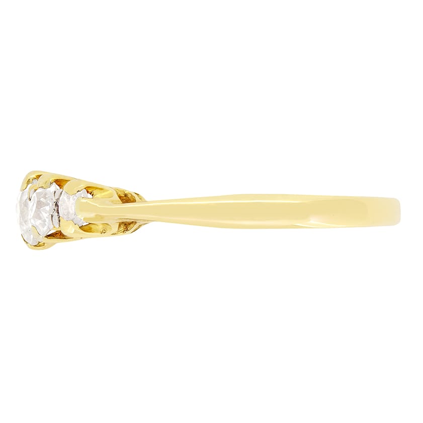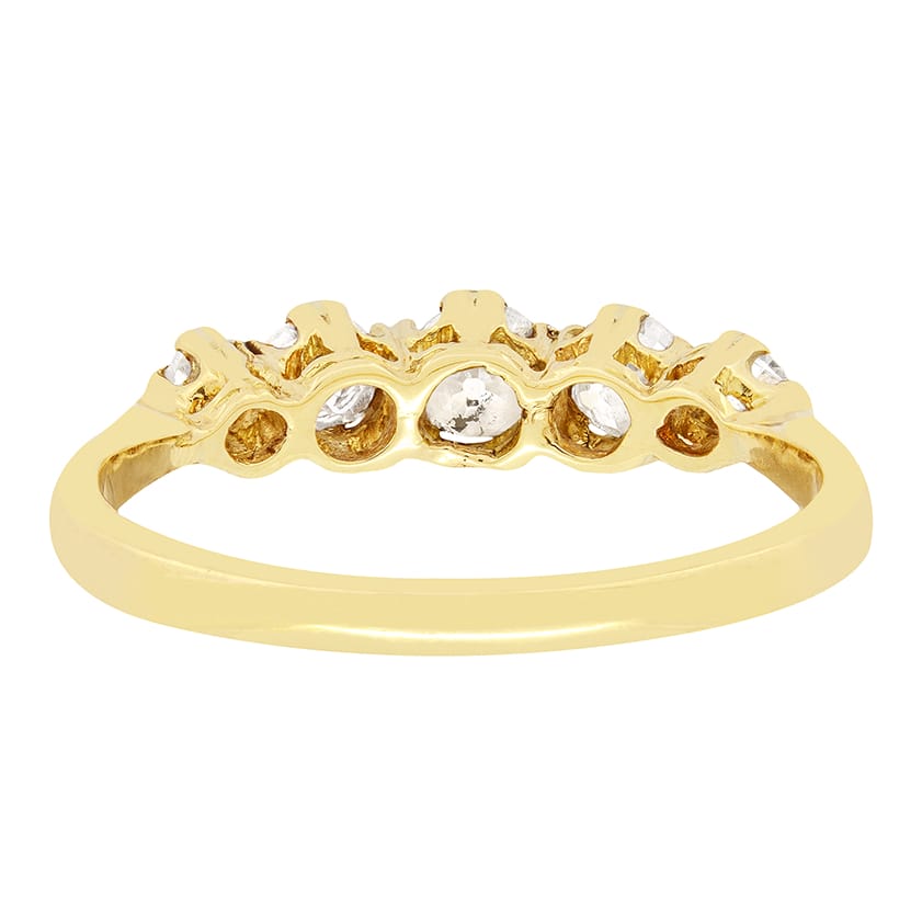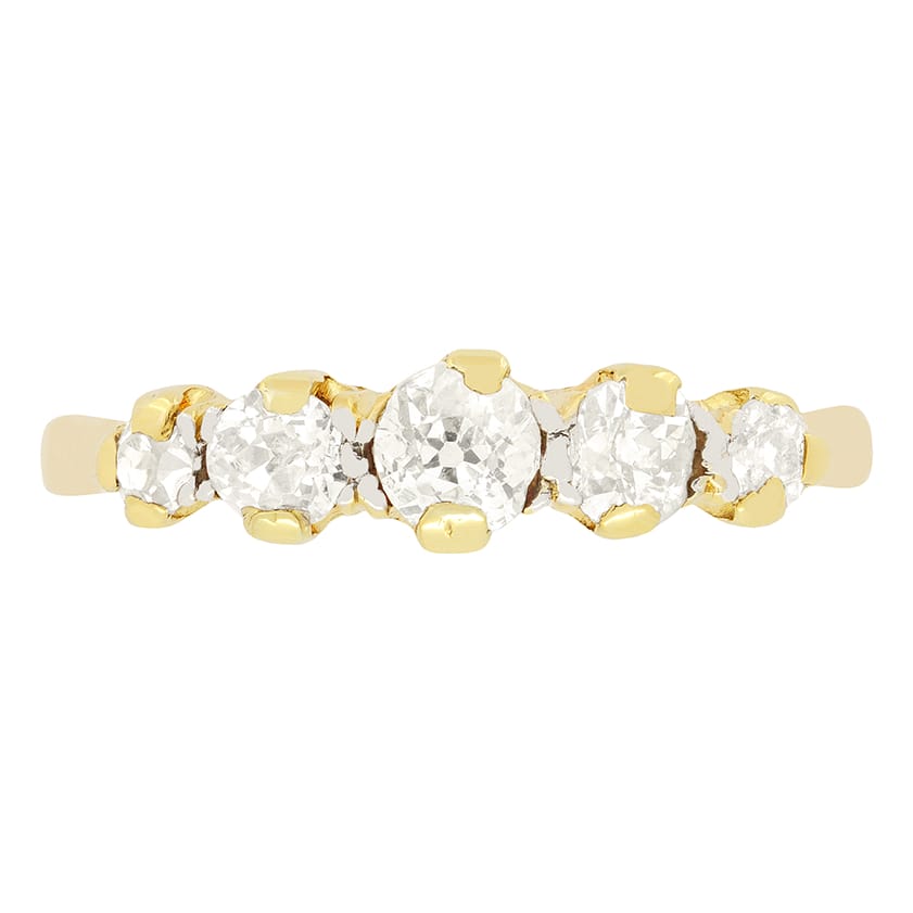 Five glistening old cut diamonds feature in this wonderful Victorian Ring. The diamonds graduate from the centre, the biggest being 0.30 carat, the flanking pair weigh 0.20 carat, with the two at either end being 0.10 carat. The diamonds range in colour from G to H and match in clarity at SI. Each stone has been claw set into 18 carat yellow gold, with platinum detailing in between, giving the look of a clean unbroken like of white diamonds across the centre of the ring head. This ring will have been crafted entirely by hand in 18 carat yellow gold.