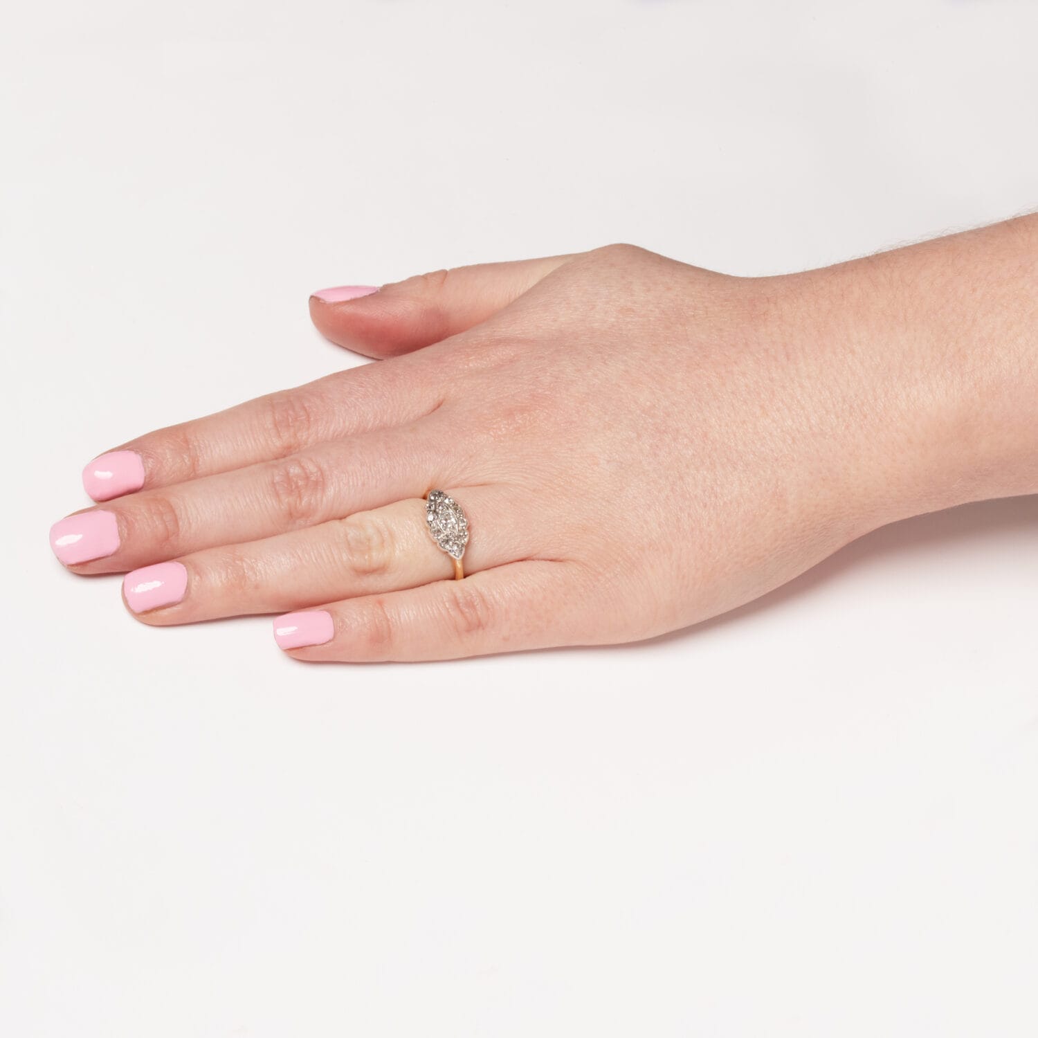 Dating to the Victorian era comes this unique horizontal boat-shaped cluster. At its centre sits a 0.30 carat old mine cut diamond surrounded by a a further collection of diamonds totalling 0.55 carat. Each diamond matches in quality at I in colour and VS2 in clarity. As was common in the Victorian era, each stone has been expertly set into silver, with a basket and band of 18 carat yellow gold.