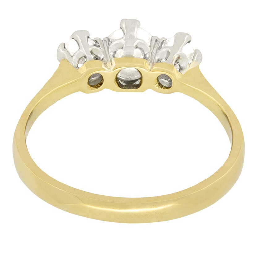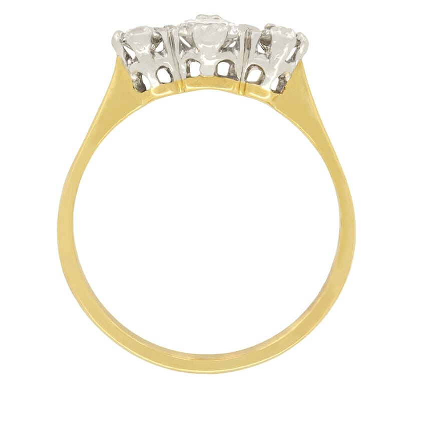 A trio of old cut diamonds elegantly adorn this Edwardian trilogy ring. The central of the three diamonds is the largest at 0.50 carat, whilst the flanking pair are 0.20 carat a piece. All three stones are of high quality, matching at F in colour and VS2 in clarity. Claw set into a platinum mount, these diamonds truly sparkle. A hand crafted band of 18 carat gold, seamlessly connects completing this beautiful ring perfectly.