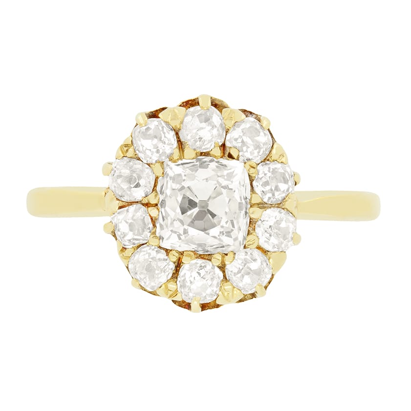 This stunning Victorian cluster ring features a glittering 1.00ct old mine cut diamond at the centre, complemented by a cluster of ten old cut diamonds, totalling an additional 1.00 carat. Each diamond used matches perfectly at J in colour and VS1 in clarity. The ring itself is crafted entirely by hand in 18 carat yellow gold with each stone has been expertly claw set.