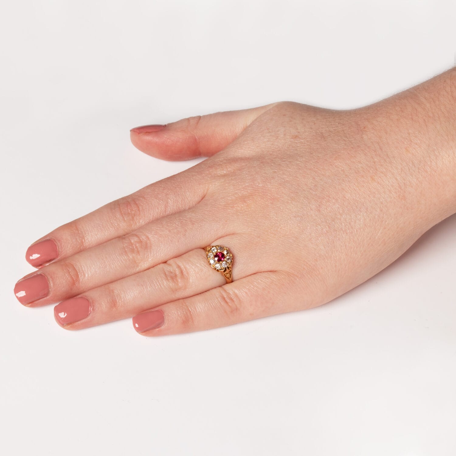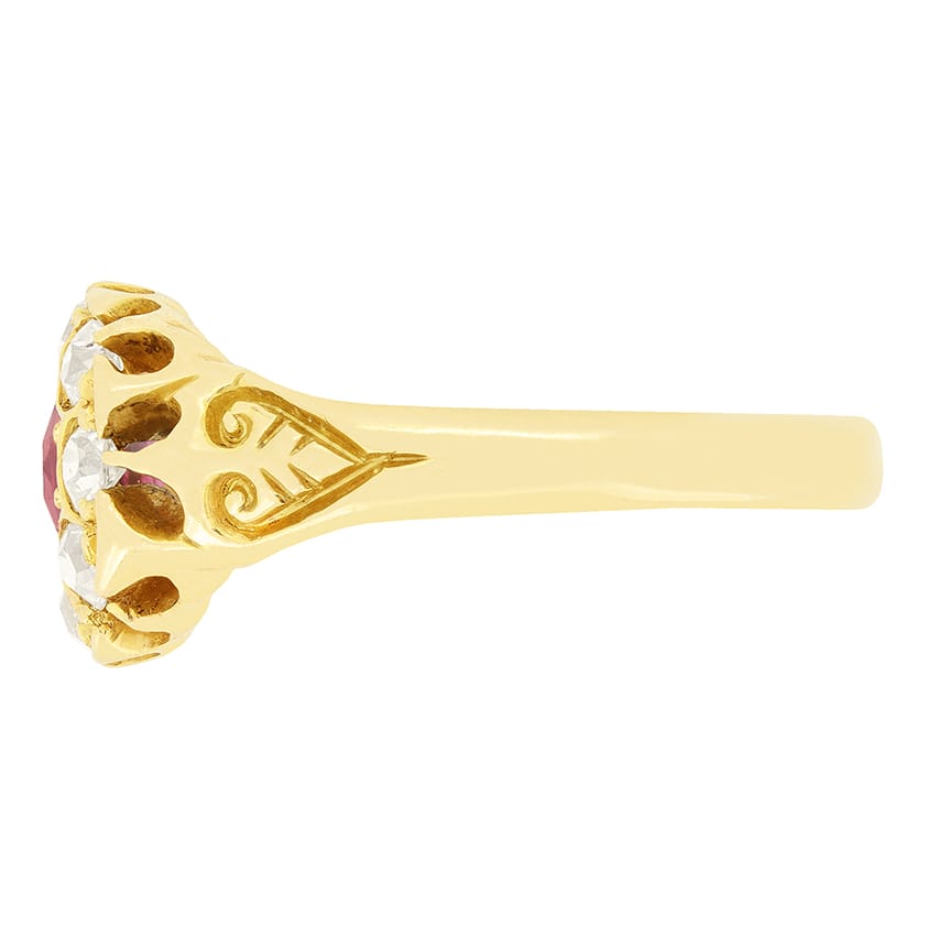 This Victorian cluster ring features hallmarks dating to 1900. At its’s centre sits an old cut ruby, claw set within gold and surrounded by a cluster of old cut diamonds totalling 0.50 carat . The ruby is a natural stone weighing 1.00 carat, whilst the diamonds total 0.40 carat and match in quality at G in colour and VS in clarity. Handcrafted in 18 carat yellow gold, the ring showcases intricate carving along the shoulders, a classic hallmark of Victorian jewellery design.