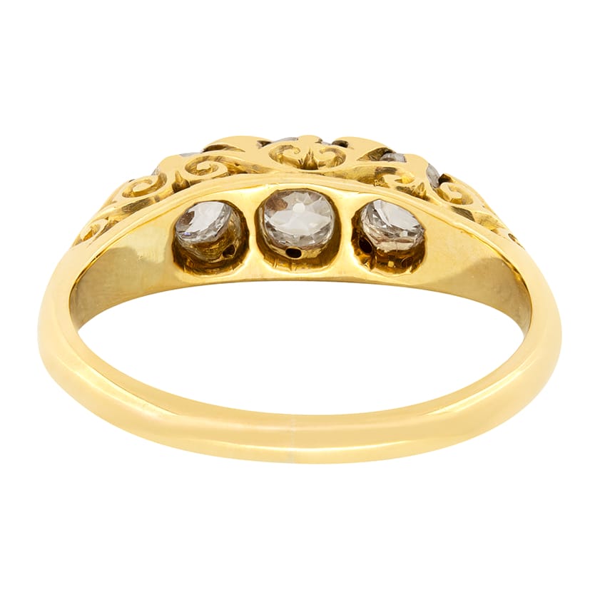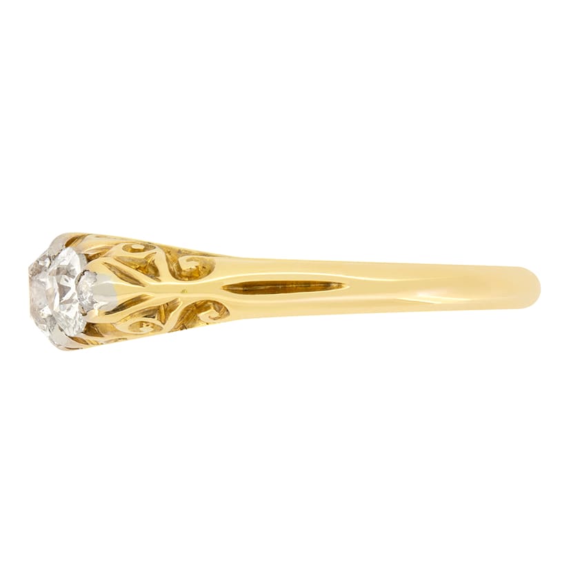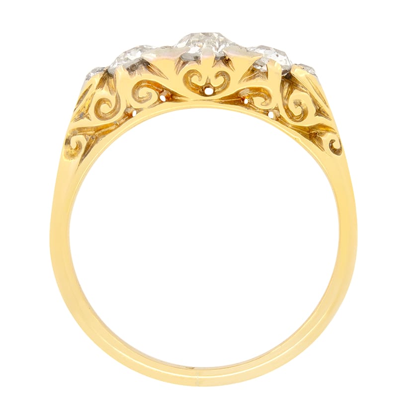 This beautiful Victorian ring showcases three old cut diamonds in a carved shank setting. The centre diamond is 0.50 carat, while the diamonds to either side are 0.25 carat each. Small rose cut and old cut diamonds are set in between the main trio, adding wonderful detailing to this charming piece. The ring itself is crafted in 18 carat yellow gold with scrolling patterns are carved along the gallery and down the shank, a classic feature of Victorian design.