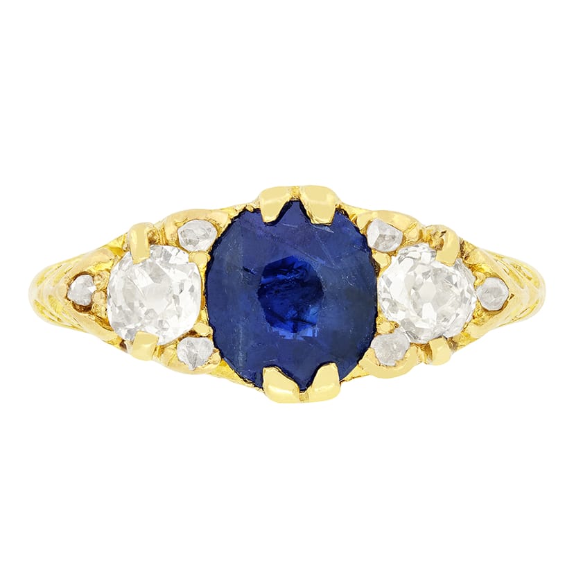 A stunning natural and unheated blue sapphire sits proud to the centre of this Victorian trilogy ring, flanked by old mine cut diamonds. The central sapphire is an oval cut stone weighing 1.05 carat, whilst the accompanying diamonds weigh 0.30 carat a piece and match in quality at I in colour and SI in clarity. Decorative rose cut diamonds sit between the main stones as well as atop each shoulder. Beautiful hand carving metalwork adorns the gallery and shank of this gorgeous ring crafted in 18 carat yellow gold.