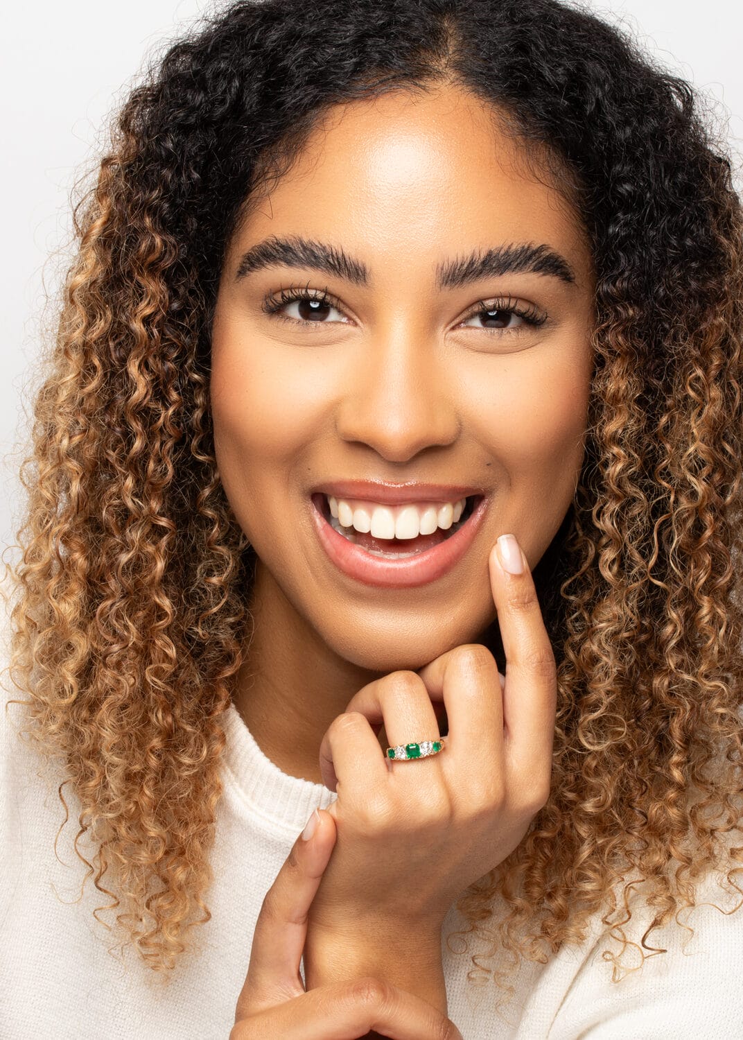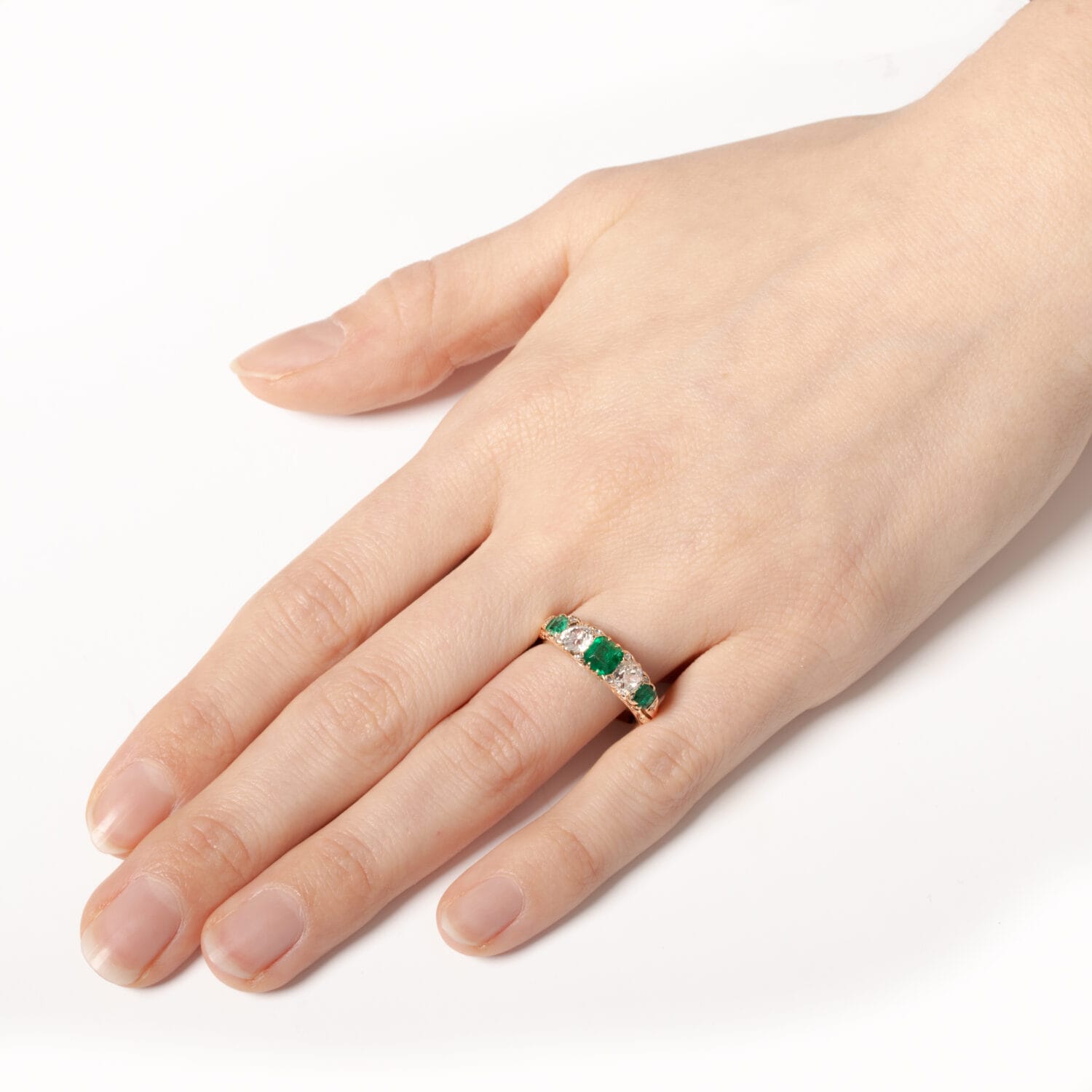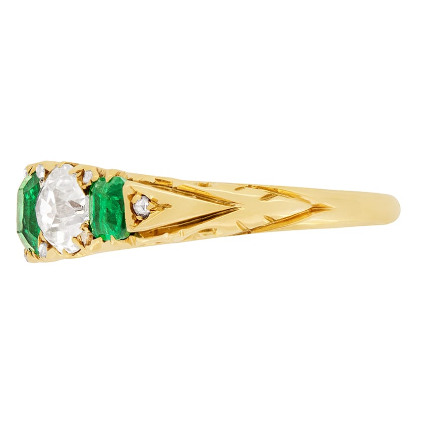This exquisite five stone ring features a central emerald cut, Columbian emerald weighing 0.65 carat, flanked by two 0.50 carat old cut diamonds and two 0.30 carat emeralds at either end. The diamonds are of high quality, with a G colour and VS clarity. Set amongst the primary stones are an additional ten small decorative diamonds setting the piece apart. The ring is crafted from 18 carat yellow gold and is beautifully adorned with hand carved details on the basketwork and shank, making it a truly intricate and unique piece.