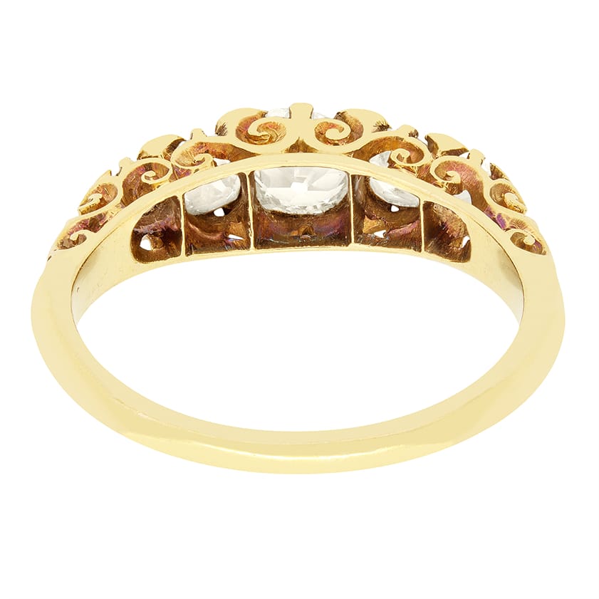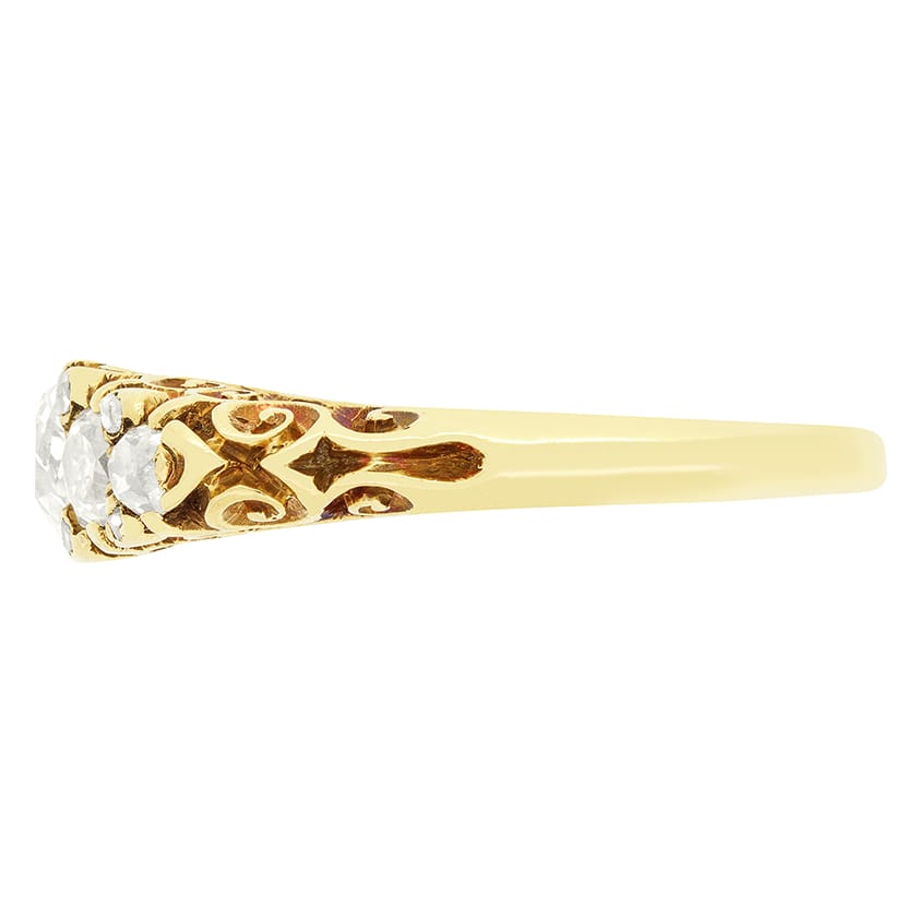 A beautiful piece of Victorian design, this five stone ring showcases a sparkling collection of old cut diamonds. The central stone weighs 0.60 carats, with two 0.25 carat diamonds flanking and smaller 0.10 carat stones at the ends. Each diamond ranges from G to H colour and matched at VS2 clarity with each stone delicately claw set. Between the primary stones, rose cut diamonds are set creating a stunning look. The ring is crafted in 18 carat yellow gold, with an elegantly carved shank that embodies the expert craftsmanship typical of the Victorian era.