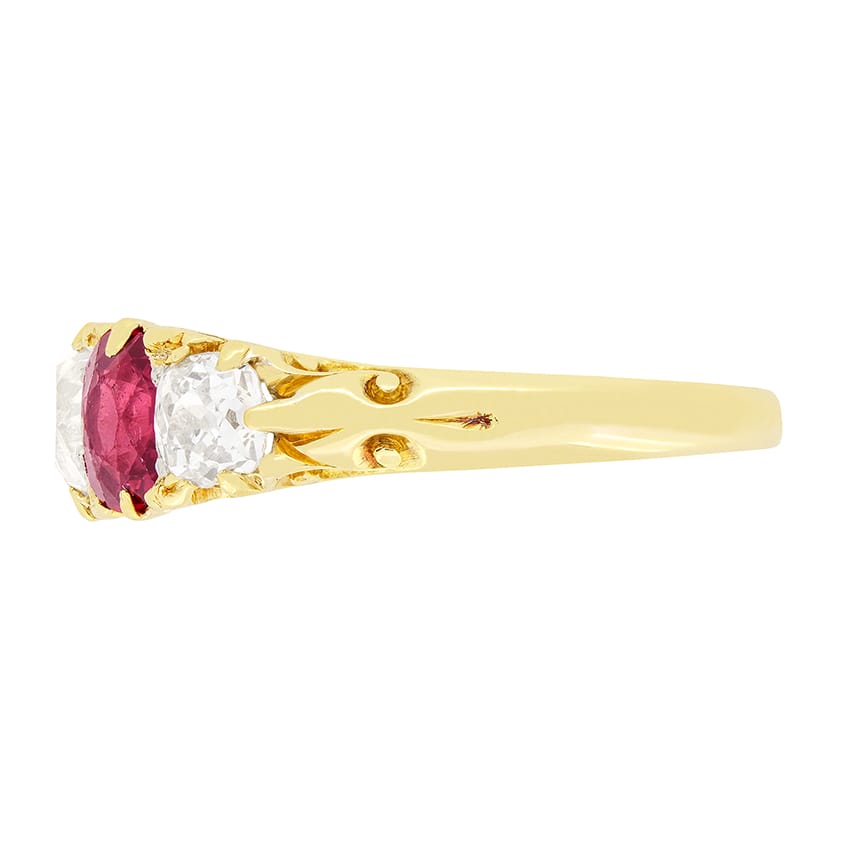 A trio of old cut diamonds are set between a pair of vibrant rubies in this Victorian five stone ring. The central diamond is 0.60 carat with the two at either end weighing 0.40 carat each. The diamonds match in quality, being graded G in colour and SI in clarity. In between these diamonds, the oval cut rubies contrast in colour beautifully, each weighing 0.60 carat. The ring is crafted from 18 carat yellow gold and features elegant detailing across the gallery.