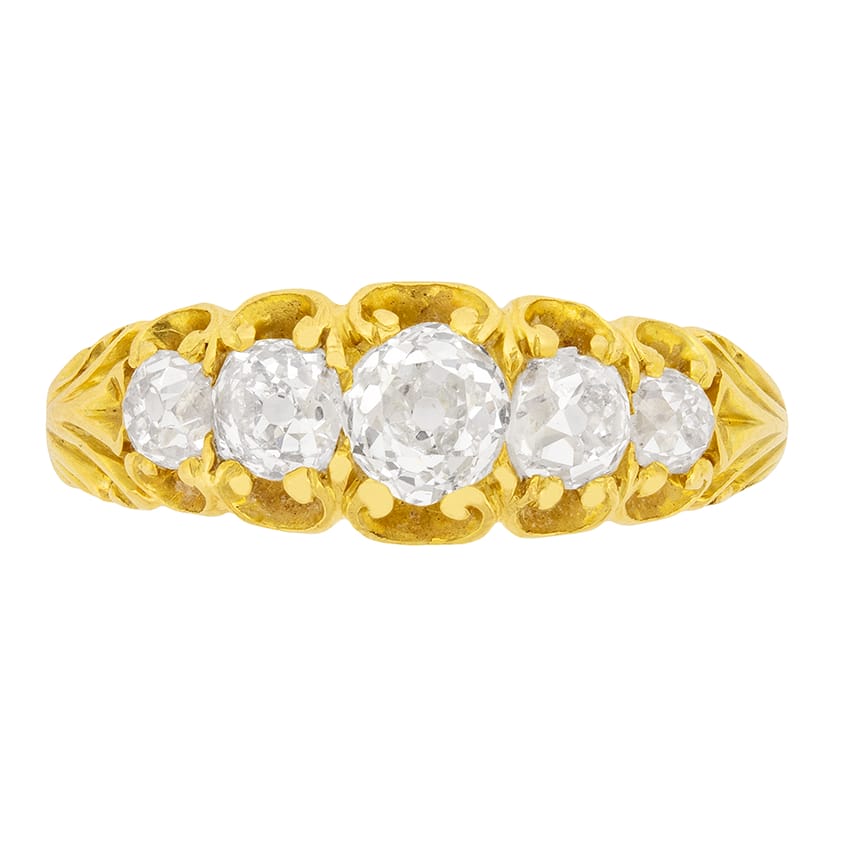 This Victorian ring is stunning, featuring five old cut diamonds in a wonderfully carved setting. The centre diamond is 0.50 carats, the diamonds to either side are 0.30 carats, while the outermost stones are 0.20 carats each. The diamonds range from G to H in colour and VS to SI clarity. The 18 carat yellow gold showcases amazing hand carved detailing, making this ring truly one of a kind. This ring would have been made entirely by hand in the 1880s.