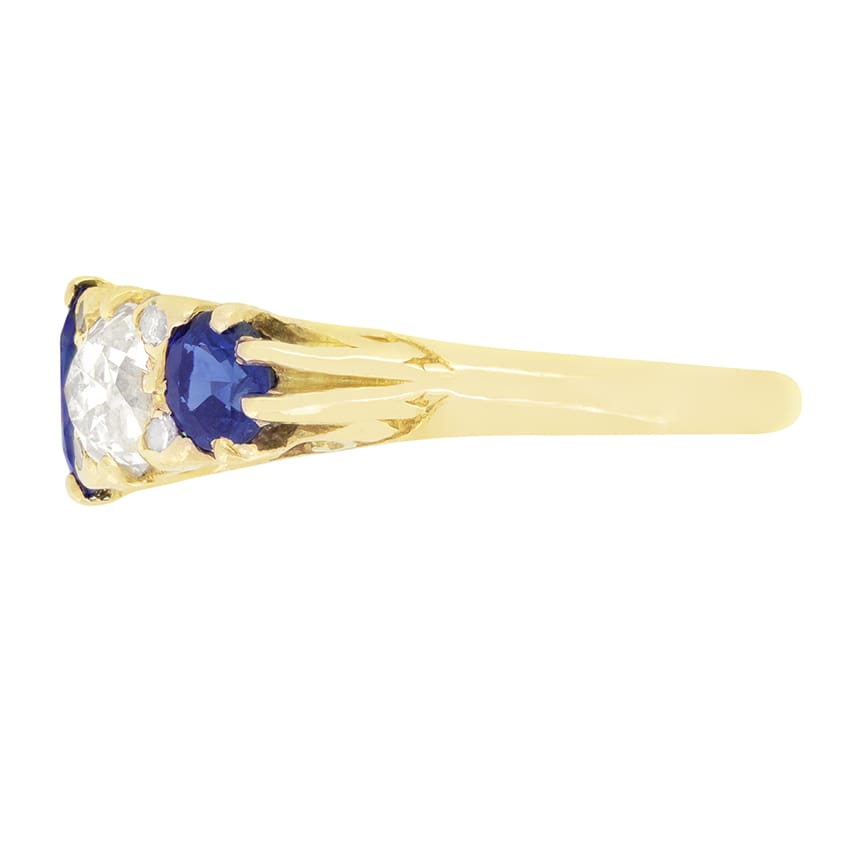 A trio of gorgeous, oval cut sapphires are set amongst a pair of old cut diamonds in this Victorian five stone ring. The central Sapphire is 1.00 carat, with the two flanking stones 0.40 carat each. In between the Sapphires, the diamonds weigh 0.65 carat a piece and have colour of H and clarity ranging from VS to SI. Adding that little extra sparkle a further eight decorative diamonds have been set in between each of the stones. The ring is crafted from 18 carat yellow gold and features elegant detailing across the gallery.