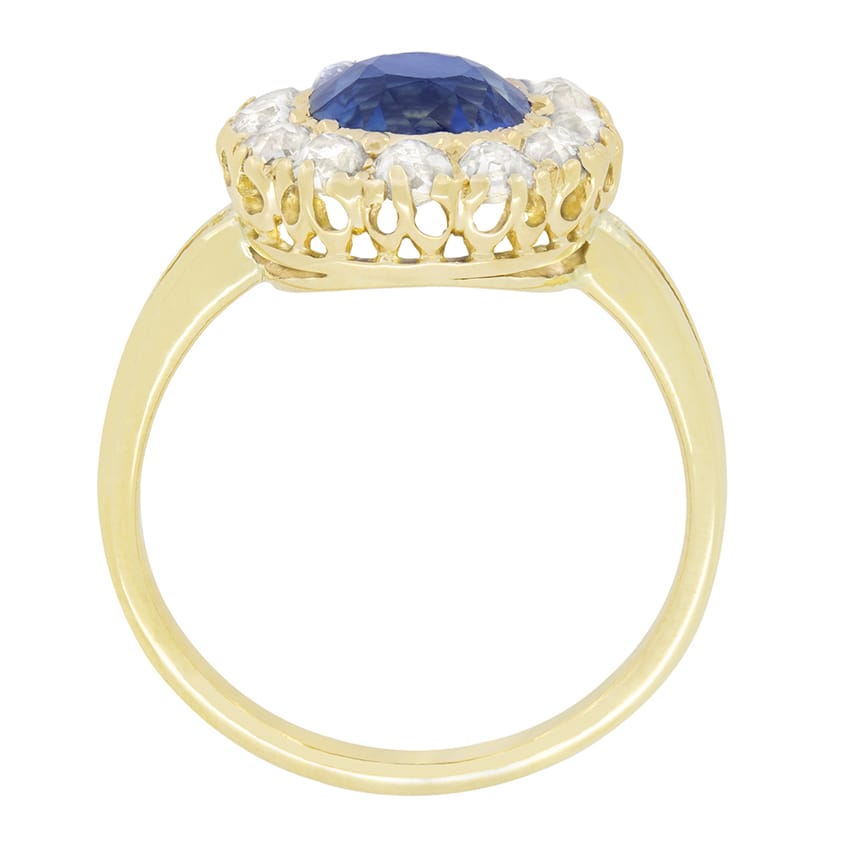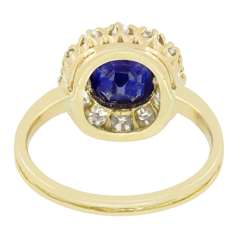 This stunning Victorian cluster ring showcases a striking 1.90 carat sapphire at its centre. The old cushion cut stone is certified by GCS and completely natural and unheated. Encircling the sapphire sits a cluster of old cut diamonds, totalling 0.84 carat, offering a brilliant contrast to the vibrant blue sapphire. The diamonds all match in colour at H and range in clarity from VS to SI. Expertly hand crafted in rich 18 carat yellow gold, this ring is a wonderful example of Victorian craftsmanship.