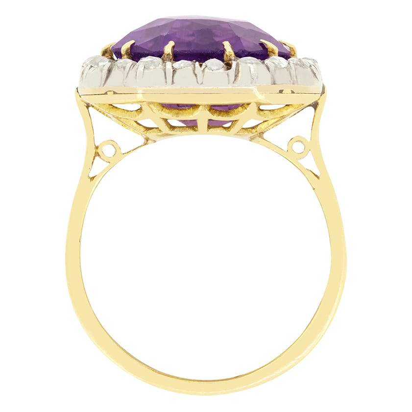 Dating to the 1900s, this stunning ring centres around an eye-catching 10.00 carat amethyst. The vivid purple stone is emerald cut and claw set in 18 carat yellow gold. Surrounding the centre gem, a cluster of rose cut diamonds are set into silver. Twenty-four diamonds in total are set, weighing 0.01 carat each. An intricately handcrafted basket and band of 18 carat yellow gold complete this wonderful piece.