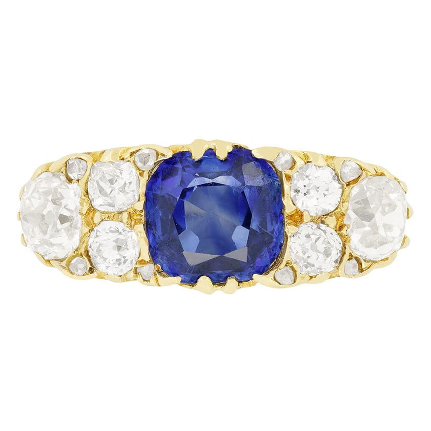 This beautiful Victorian ring showcases a natural blue sapphire at its centre. The cushion cut stone is an unheated stone of Sri Lankan origin with a weight of 2.00 carat. Flanking the sapphire, two 0.10 carat and one 0.40 carat old cut diamonds are set on each side, totalling 1.20 carat. The diamonds range in colour from H to I and match in clarity at VS2. This stunning piece is crafted in 18 carat yellow gold, with a beautifully carved gallery and shank, a classic design motif in Victorian craftsmanship.