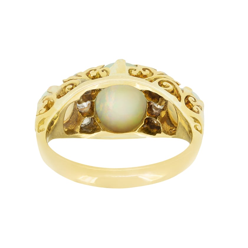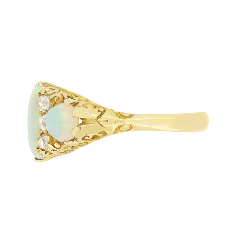 This stunning Victorian three stone ring features a trio of iridescent Opals. The central opal is 1.30 carat whilst the outer pair are 0.40 carat a piece. Set in between the three primary stones are two vertical lines of peruzzi cut diamonds, totalling 0.50 carat. The ring itself has been expertly handcrafted from 18 carat yellow gold with meticulously carved detailing across the gallery and flowing down the shoulders.