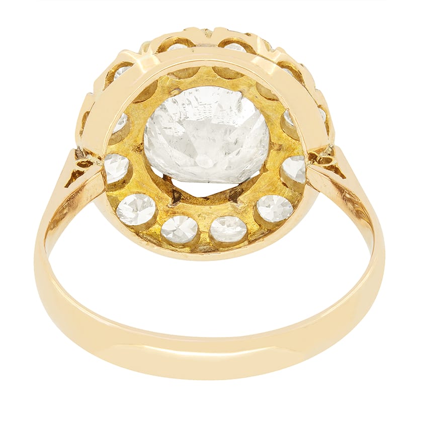 This impressive Victorian cluster ring centres around a beautiful old cut diamond surrounded by a dazzling halo of old cut diamonds. The central stone weighs 2.50 carat with a colour of I and clarity of SI2. The halo is composed of twelve old cut diamonds totalling to a futher 1.56 carat. These diamonds range in colour from G to H and in clarity from VS to SI. The stones are claw set into an entirely hand crafted ring, made in 15 carat rose gold. This piece is a true one off gem of the 1880s.
