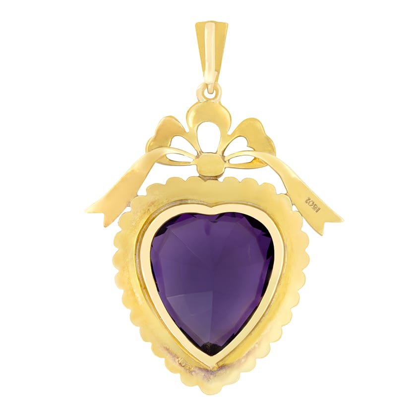 A beautiful 28.80 carat amethyst heart takes centre stage in this Victorian pendant. Set into 15 carat yellow gold the deep purple amethyst is framed by a total of thirty half seed pearls. These pearls adorn the metal work both around the heart and across the bow motif up to the bail to create a stunning look. This wonderful piece measures 5cm by 3.5cm making it very wearable.