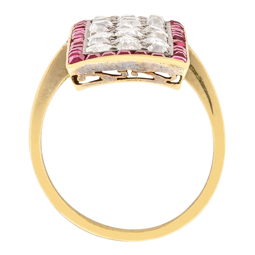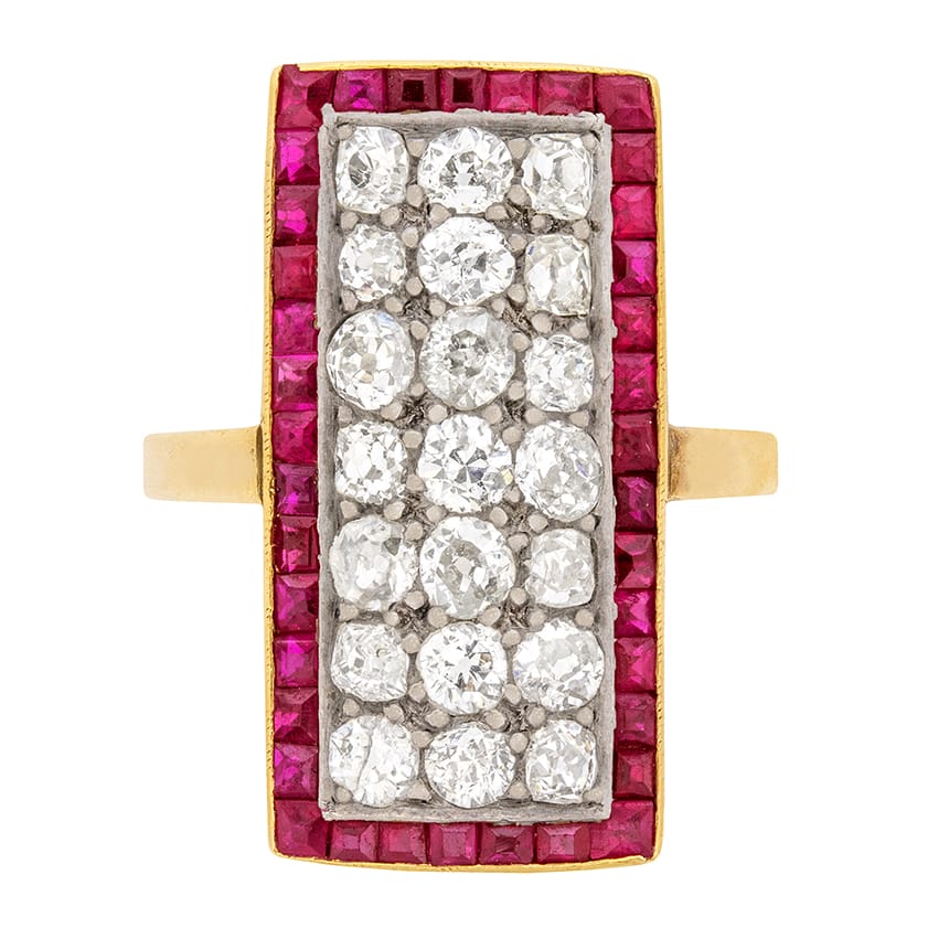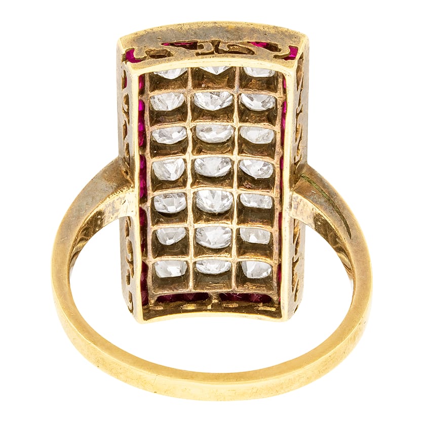 This stunning Victorian ring is perfect for special occasions. Twenty-one old cut diamonds form the centre, while thirty-eight baguette cut rubies line the outer edge. The diamonds total to 3.00 carat, and are I to J in colour and VS to SI in clarity. The rubies were painstakingly cut to fit perfectly into the channel style setting, and total to 1.14 carat. The diamonds are set in silver, while the band is made of 18 carat yellow gold, a combination popular in the Victorian Era. This stunning cocktail ring was made by hand in the 1880s.