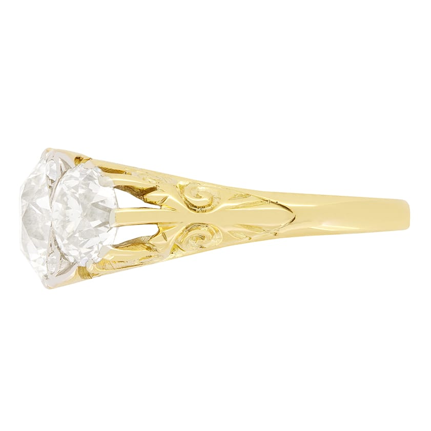 Three eye catching old cut diamonds steal the show in this impressive Victorian three stone ring. The central diamond is the biggest at 3.10 carat, whilst the flanking pair weigh 1.20 carat each. All claw set into platinum, the detailing is impeccable and shows the craftsmanship of the ring. The diamonds have been graded between I and J in colour and between VS and SI in clarity. Four additional 0.03 old cut diamonds highlight the centre stone adding a little extra sparkle to this already incredible ring. The ring itself has been hand made from 18 carat gold and features intricate hand carving work along both shoulders and the gallery. This ring is truly a statement piece.