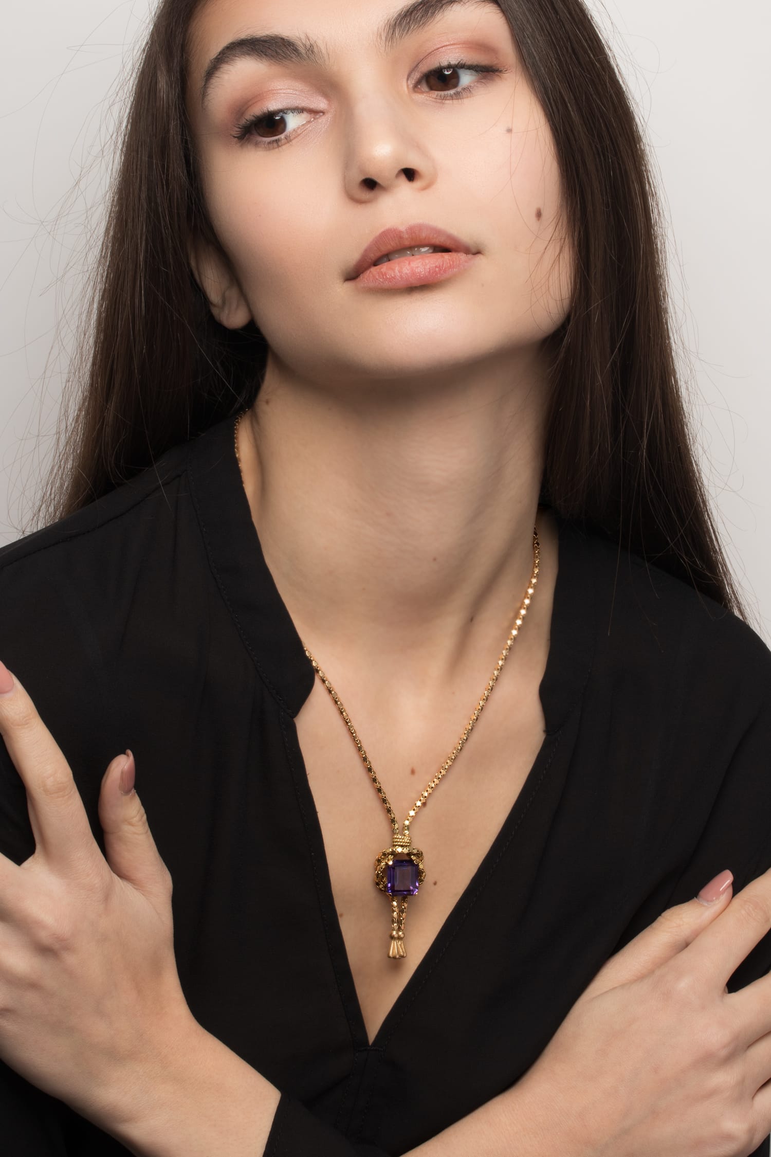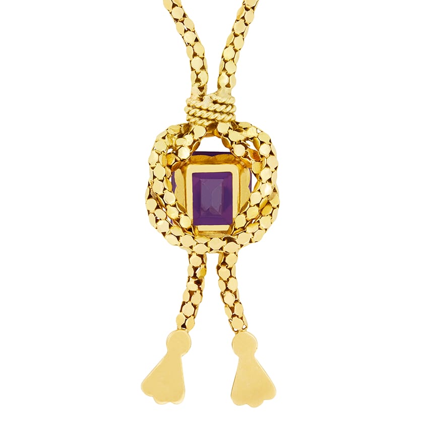 An eye catching 8.20 carat Amethyst sits central to this necklace from the 1880s. The 18 carat yellow gold chain loops around the claw set central gem in a knot like pattern and finishes in two hanging tassels. The chain is 19″ in length.