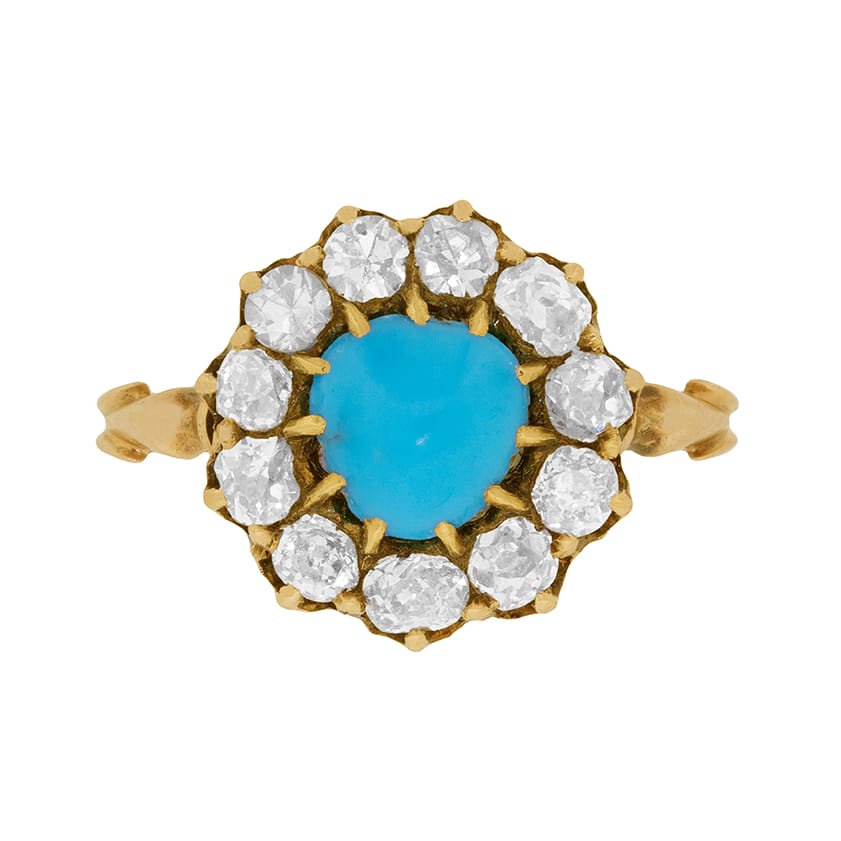 A bright blue cabochon turquoise is centred within a halo of old cut diamonds at the heart of this late Victorian era ring dating from the 1880s. The turquoise weighs 1.00 carat exactly, whilst the the halo of dazzling diamonds equates to 1.10 carat. The stones are estimated to be H in colour and SI1 in clarity. The ring’s original 18 carat yellow gold setting was handmade in period style with claw and grain mountings, a pierced gallery and stylised shoulders.