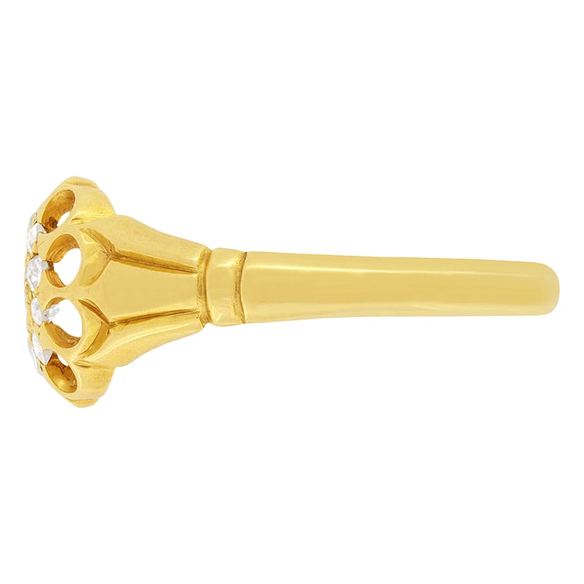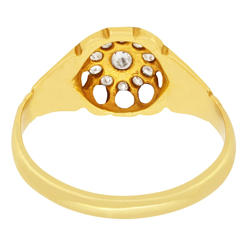 This cluster ring dates back to approximately the 1900s, and is made entirely of 18 carat yellow gold, a typical feature if this era. It features a cluster of old cuts diamonds, which have a combined weight of 0.25 carat. Although small, they sparkle in colour and have a estimated grade of G. Their clarity is graded VS and they are grain set within the collet. The metal work is impeccable and the craftsmanship shines through in the detailing on the shoulders and the open back setting.