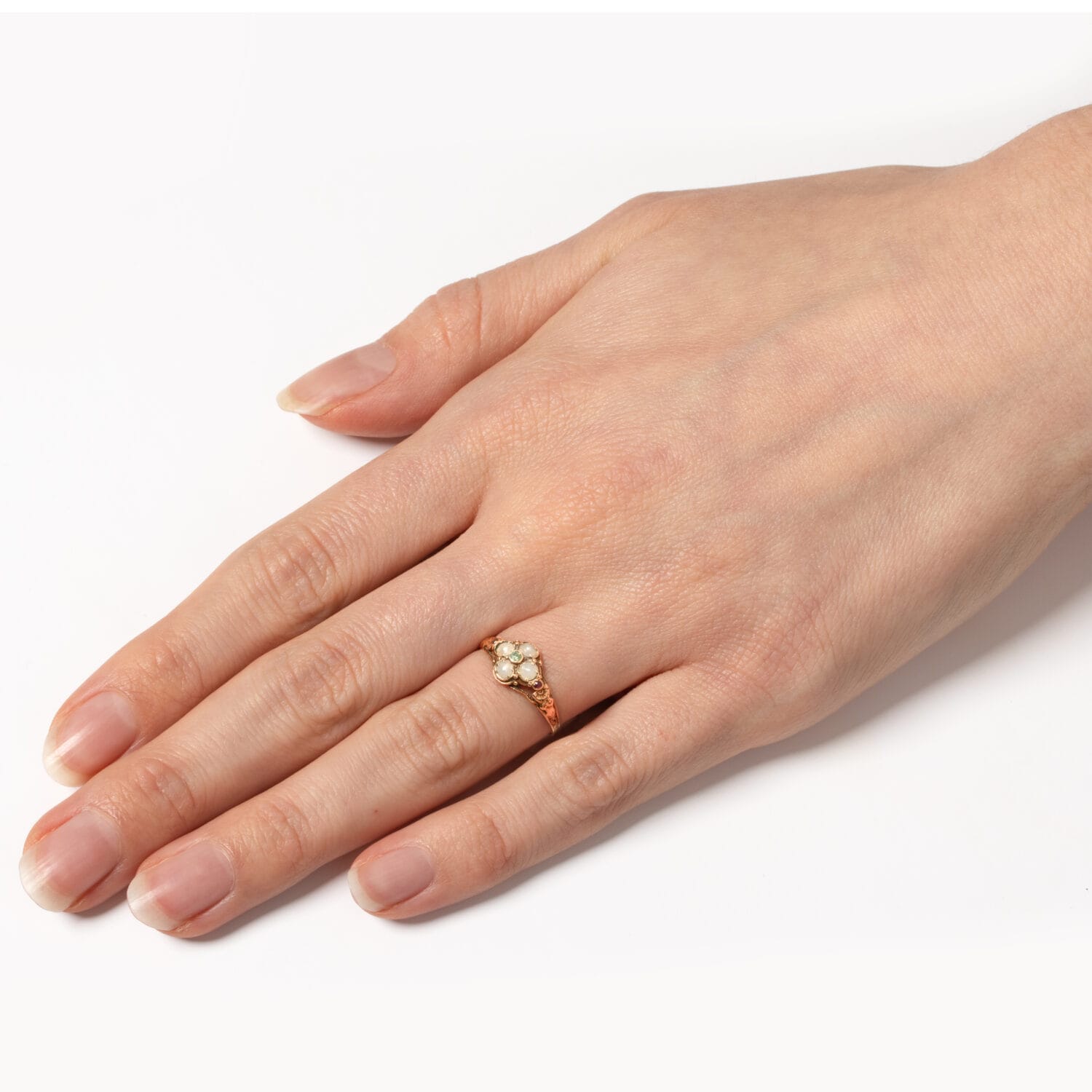 The wonderful Victorian ring, features Emerald, Pearl & Rubies. The rub over set emerald at its centre is 0.05 carat and is accented by four 3mm pearls, one at each of the cardinal points. The split shoulders of the ring hold two rubies, each weighing 0.02cts. These gemstone detailing leads down to a meticulously carved floral design on the 15 carat rose gold band. This ring shows the elegance and craftsmanship of the Victorian era.