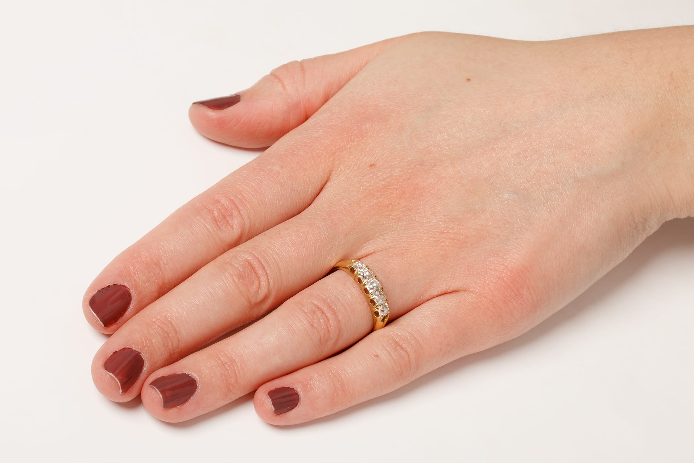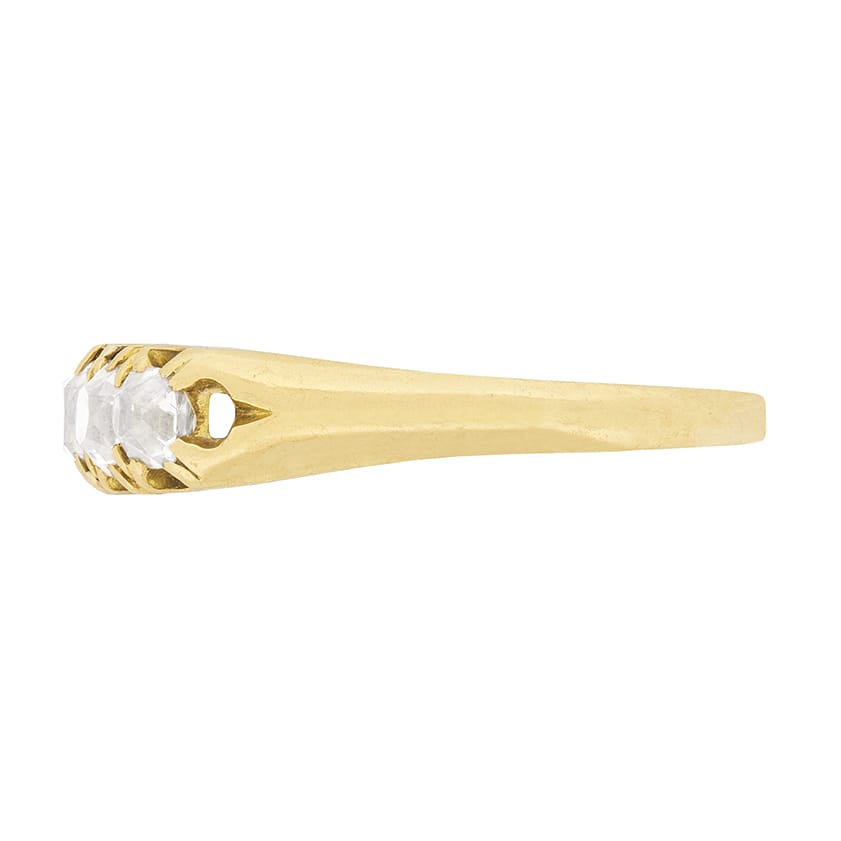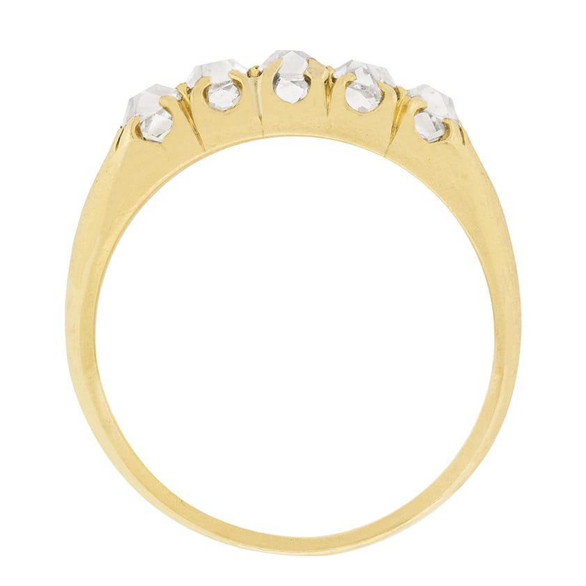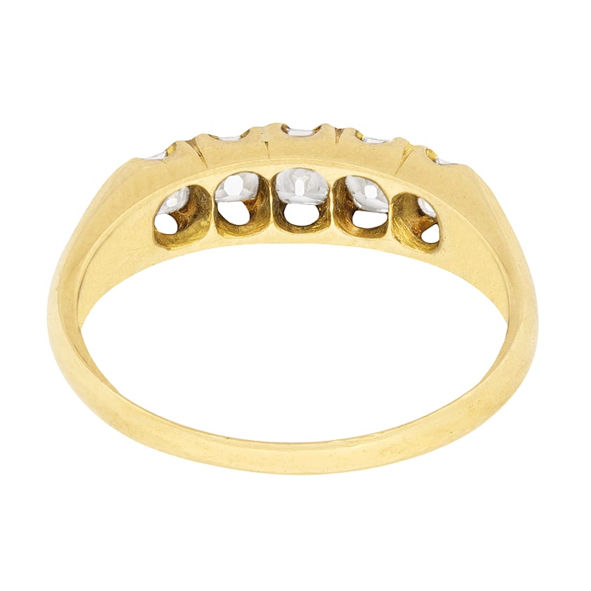 This beautiful, handmade, Victorian ring, has five old cushion cut diamonds within a claw setting. The diamonds are similar in size, with the central three each weigh 0.20 carat and the two on either end each weighing 0.15 carat. The diamonds are hand cut and estimated as G in colour and VS in clarity. The ring is hand made from 18 carat yellow gold and dates to approximately the 1900s.