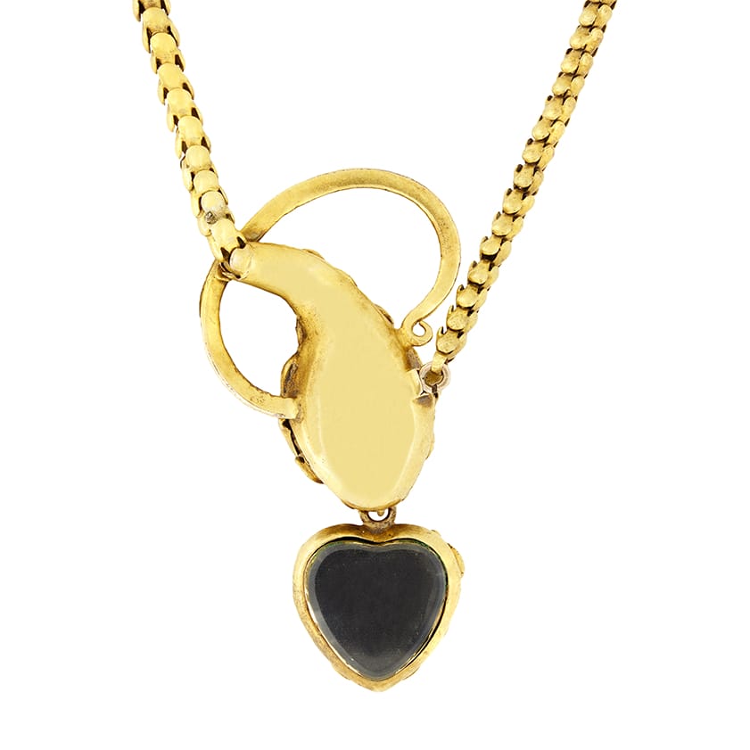 Dating to the Victorian era, this stunning necklace takes on the likeness of a snake. Crafted in 15 carat yellow gold the handcrafted piece features a collection of garnets and citrines. The largest of the garnets sit atop the snake’s head and the heart it holds in its mouth, with smaller garnets and citrines surrounding both. The elegant snake motif continues around the neck with a distinctly scale-like chain sitting at 14″ around the neck, then curling around the head to form the snake’s tail. Crafted in the 1850s, this is a truly beautiful piece of early Victorian design.