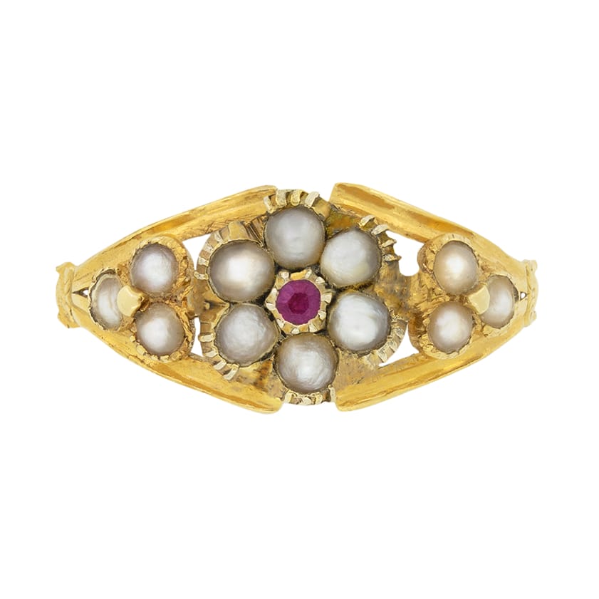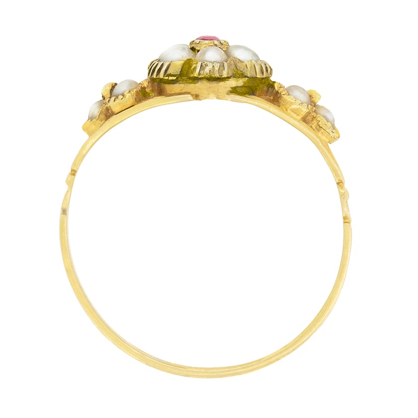 A collection of pearls surrounds a single garnet in this sweet Victorian ring. The garnet is a 0.01 carat old cut stone, adding a pop of colour amongst a flower design created in pearls. An additional three pearls sit on each shoulder, completing the design. The ring itself is handcrafted in 15 carat yellow gold.