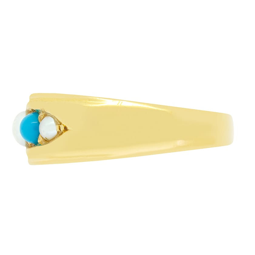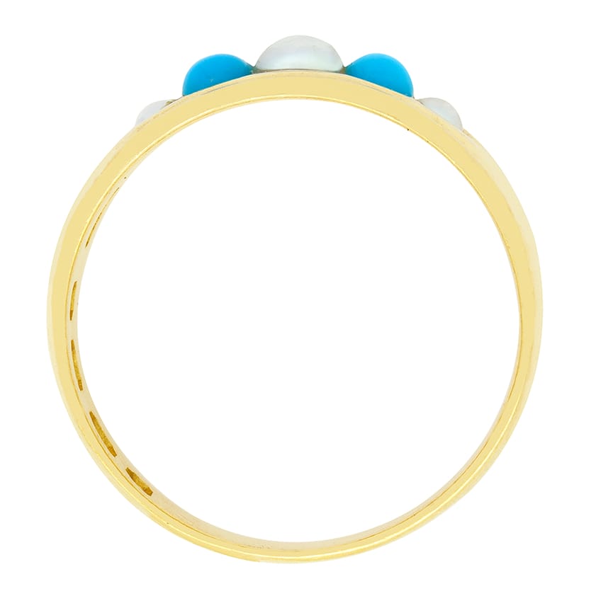 This wonderful Victorian band ring features a collection of pearls and turquoise’. The gem pattern is made up of one centre half pearl, flanked by two half turquoise’ with a further two pearls on either end. Crafted in 18 carat yellow gold the band gently tapers around the finger for a sleek look. This beautiful piece has hallmarks dating it to 1891.