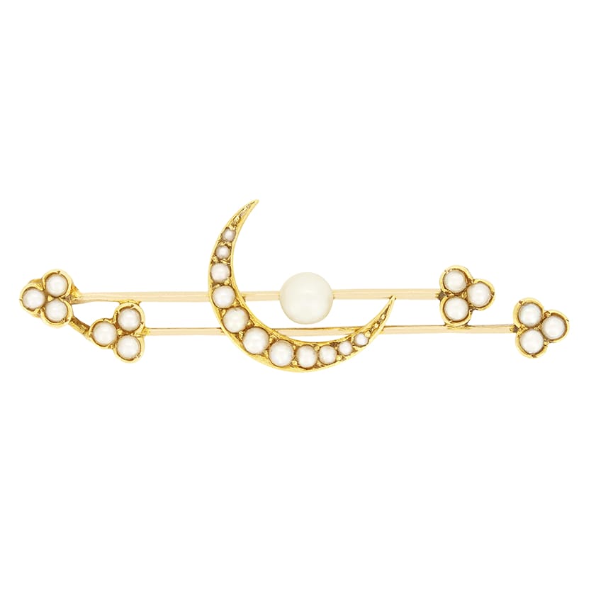 Hand crafted in the Victorian era, this beautiful brooch is made in 15 carat yellow gold. It features a collection of twenty four pearls of varying sizes across its design of a moon in the centre and floral depictions on either end. This wonderful piece features a pin back to attach it securely to your clothing.