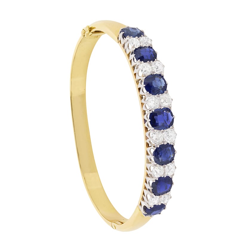 This is a beautiful, handmade piece of jewellery dating to the 1900s. The natural sapphires have a combined weight of 7.10 carat; the centre sapphire weighs 1.10 carat whilst the remaining each weigh 1.00 carat. In between the cushion cut gemstones are sparkling old cut diamonds. There are four diamonds weighing 0.30 carat and the remaining eight diamonds weigh 0.25 carat each. This brings the total to 3.20 carat and all the diamonds are estimated as F to G in colour and VS in clarity. The setting work has been hand crafted in platinum, whilst the bangle has been made in 18 carat yellow gold, typical of the Victorian era.