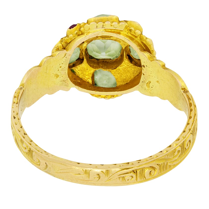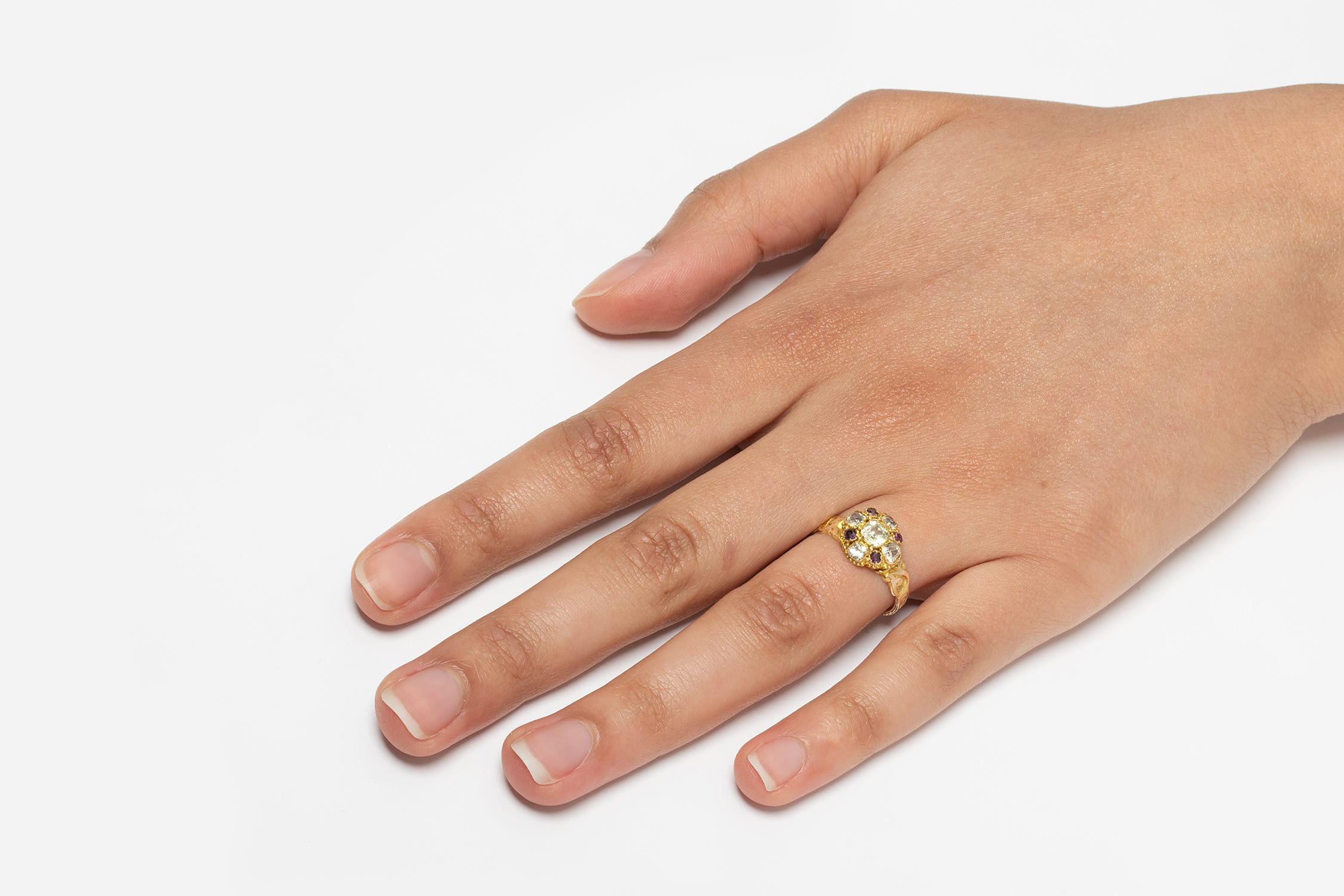 A compelling ring dating back to the 1860s. Five twinkling yellow sapphires and four rubies are set in a daisy style. To the centre sits the largest sapphire weighing 0.40 carat with the other four surrounding totalling to 0.50 carats. Alternating in between the sapphires are the sweet rubies weighing 0.05 carat each. Along the shoulders, a beautiful carved patterning flows round honourably representing the Victorian era.