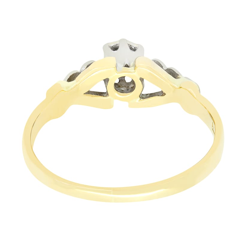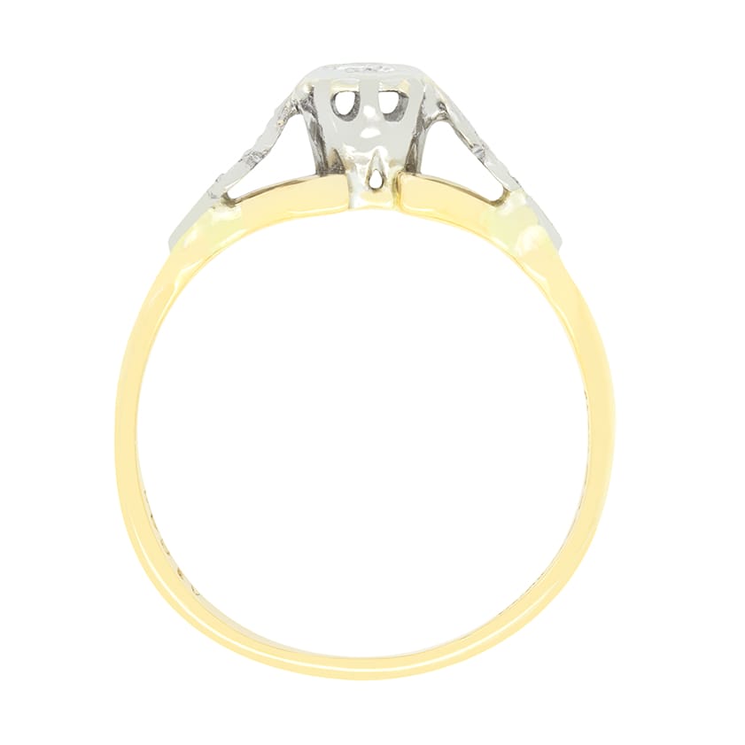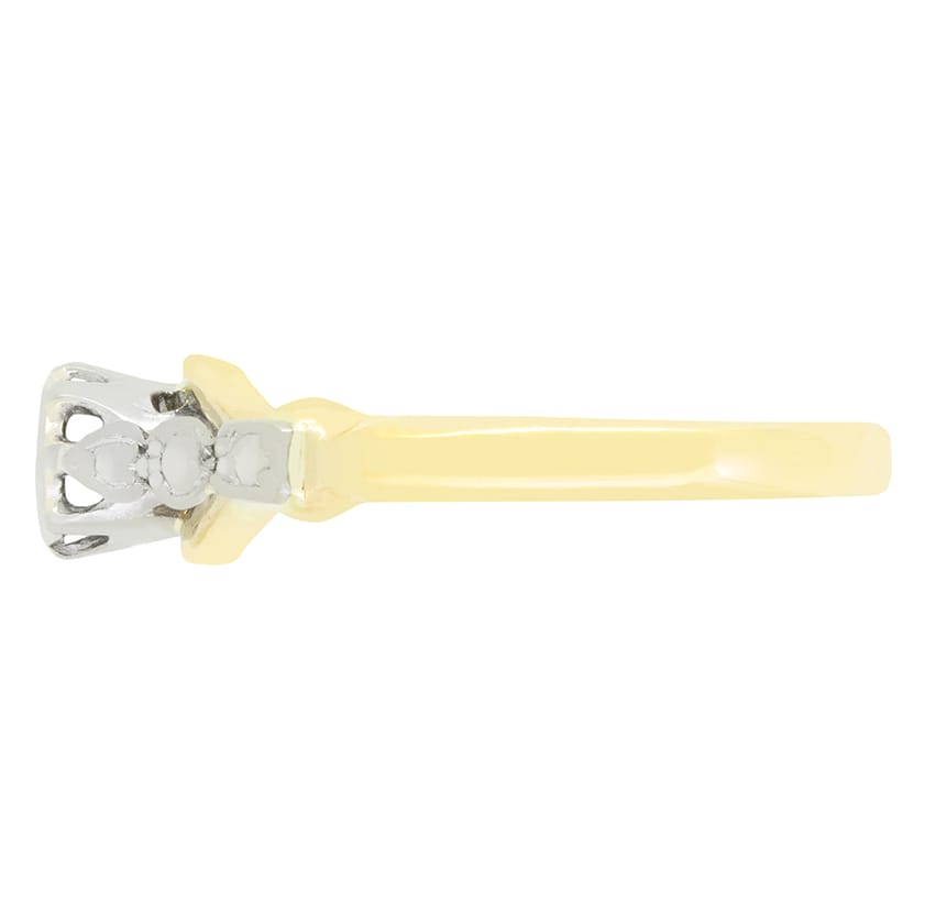 This Charming Vintage solitaire ring features a single round brilliant cut diamond at its centre. The 0.10 carat diamond has a colour of G and clarity of SI1 and is rub over set into an illusion style setting. Flanking the centre collet, detailed shoulders of platinum sit between a split 18 carat yellow gold band adding wonderful detailing.