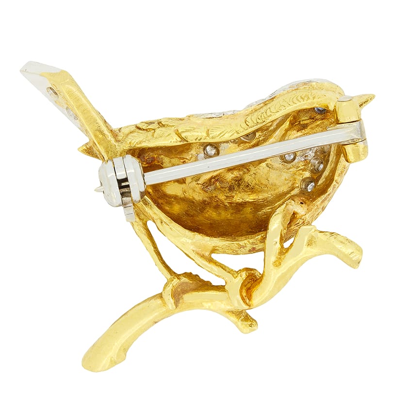 Dating to the 1970s, this charming brooch takes on the likeness of a bird perched on a branch. Crafted in 18 carat yellow and white gold, the bird features delicate carving to create its plumage, which is adorned with gently glistening round brilliant diamonds. The diamonds total 0.15 carat and are of high quality at F in colour and VS in clarity. A single 0.01 carat sapphire has been used to denote the bird’s eye and complete the likeness. A simple pin back holds the brooch firmly in place.