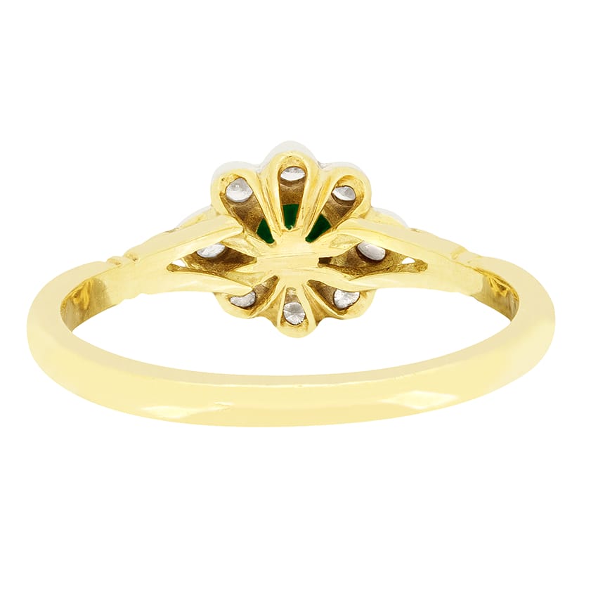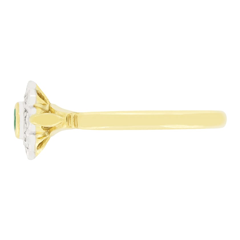 This delightful cluster ring features hallmarks dating it to 1998 and centres around a lively green emerald. The 0.15 carat emerald is a round cut stone, rub over set within 18 carat yellow gold. Enveloping the central stone, a collection of round brilliant diamonds totals 0.18 carat. Each sparkling diamond matches in quality at F in colour and VS in clarity and are set into platinum. A basket and band of 18 carat yellow gold complete this wonderful ring.