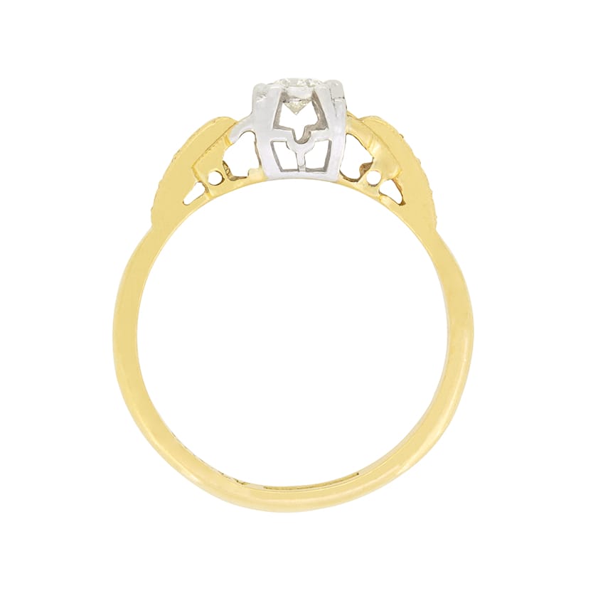Dating to the 1960s comes this charming diamond solitaire ring. At it’s centre a 0.20 carat round brilliant diamond is claw set within a square platinum illusion setting. The diamond is of I colour and VS1 clarity. Wonderfully crafted shoulders lead down from the setting work in a contrasting 18 carat yellow gold into a simple band completing the piece.