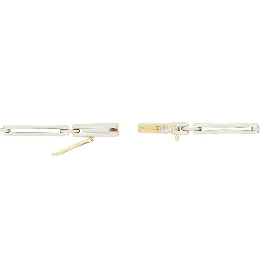 Made in the 1950s, this delightful bracelet showcases a geometric design with sparkling transitional cut diamonds. Set into platinum, each diamond weighs 0.05 carat with a colour of H and clarity of VS. The bracelet is backed in 14 carat yellow gold and sits at 17.5cm in length, making it perfect for day-to-day wear.