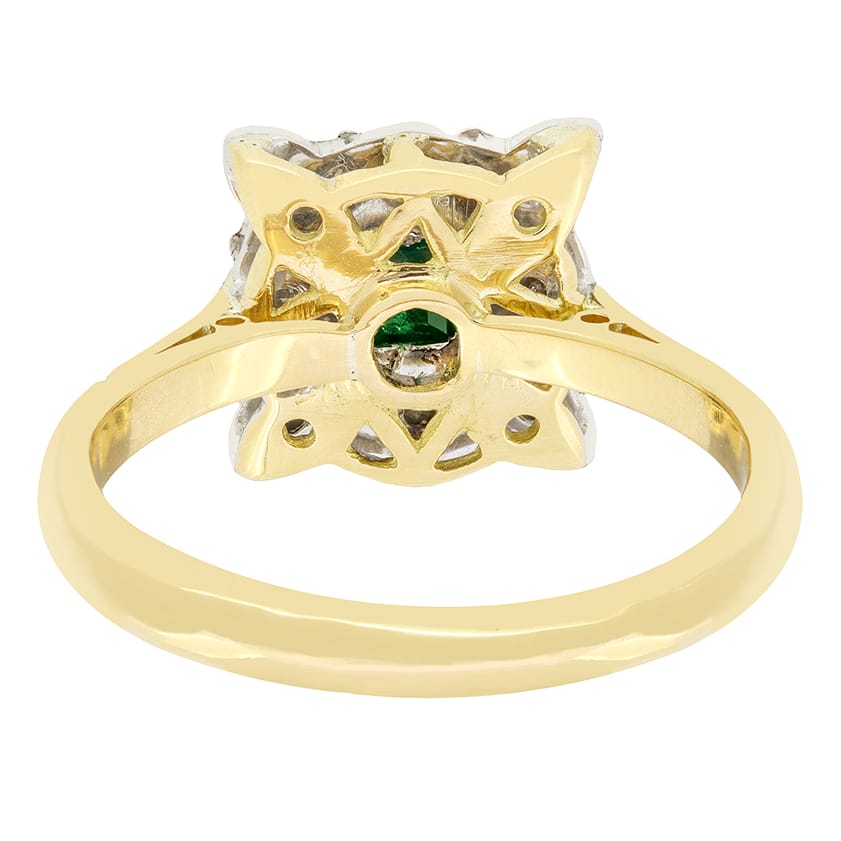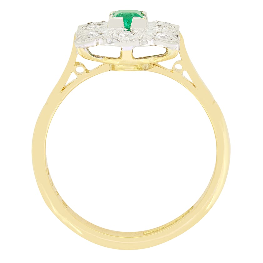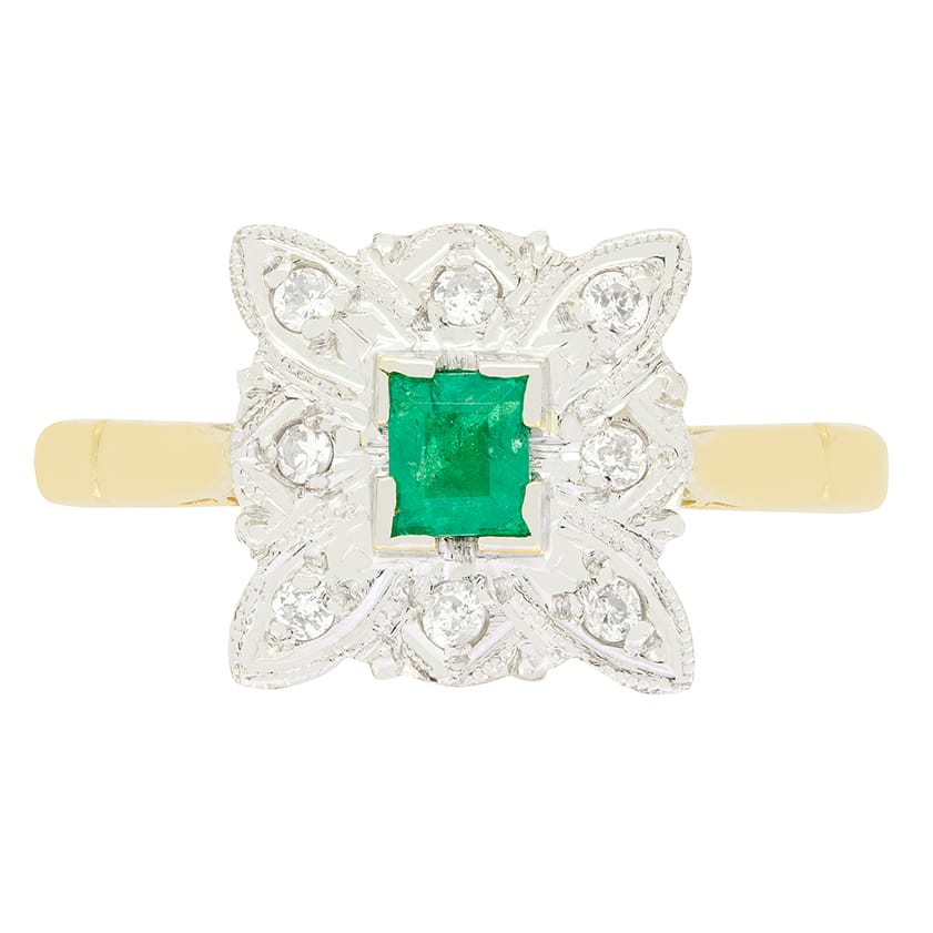 Dating to the 1950s, this charming cluster ring features a square cut emerald surrounding by eight cut diamonds all set within intricately shaped platinum. The Emerald weighs 0.25 carat, whilst the diamonds total 0.08 carat. The diamonds each match in quality at H in colour and SI in clarity. The rings platinum head sits upon a contrasting basket and band of 18 carat yellow gold to create a beautiful dual metal design.