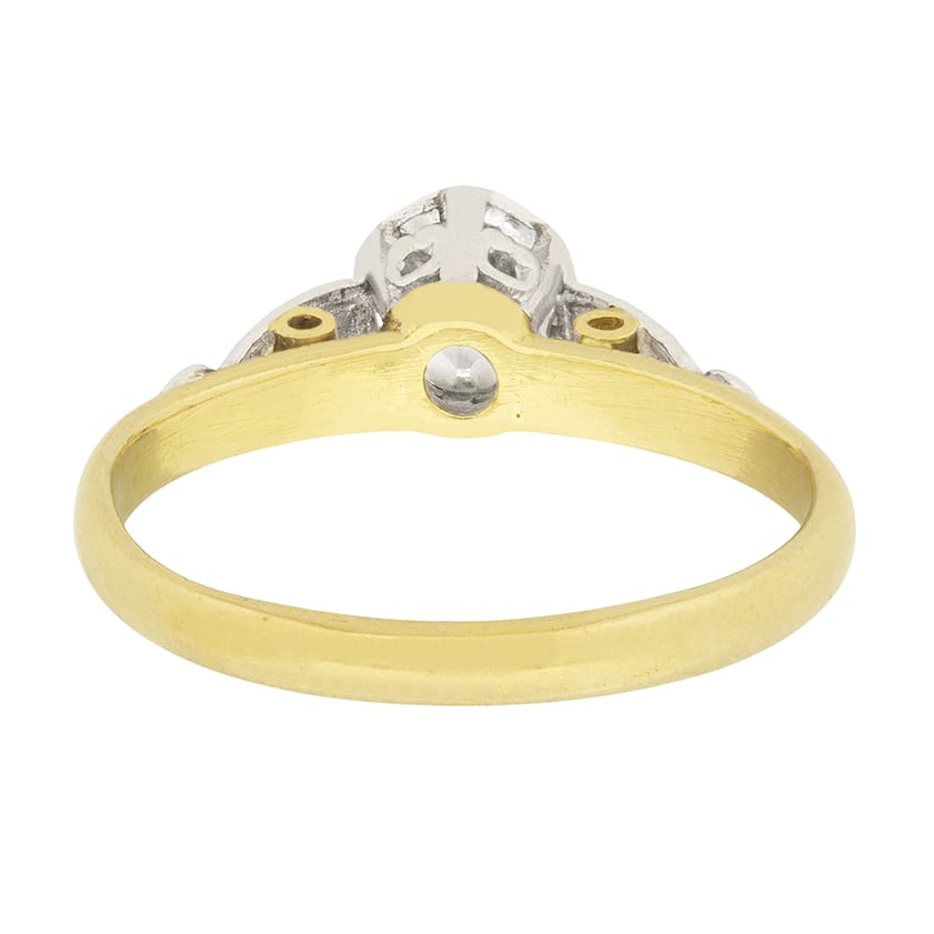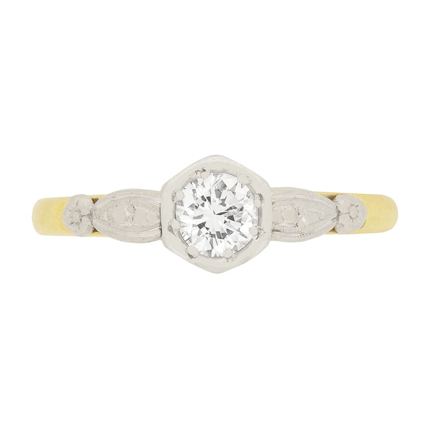 This pretty engagement ring was crafted in the 1950s and features a 0.35 carat diamond. It is round brilliant cut, and is an excellent F colour and VS2 clarity. The diamond is set in a platinum illusion setting, making the gem appear slightly larger. The band is made of 18 carat yellow gold.