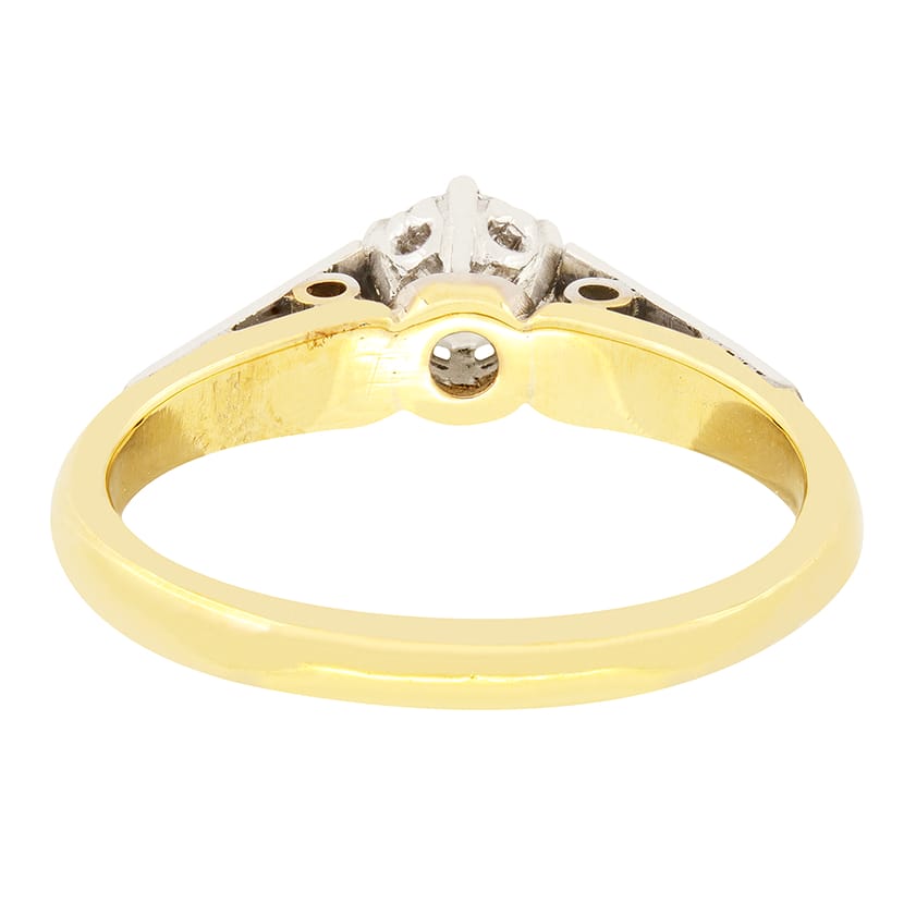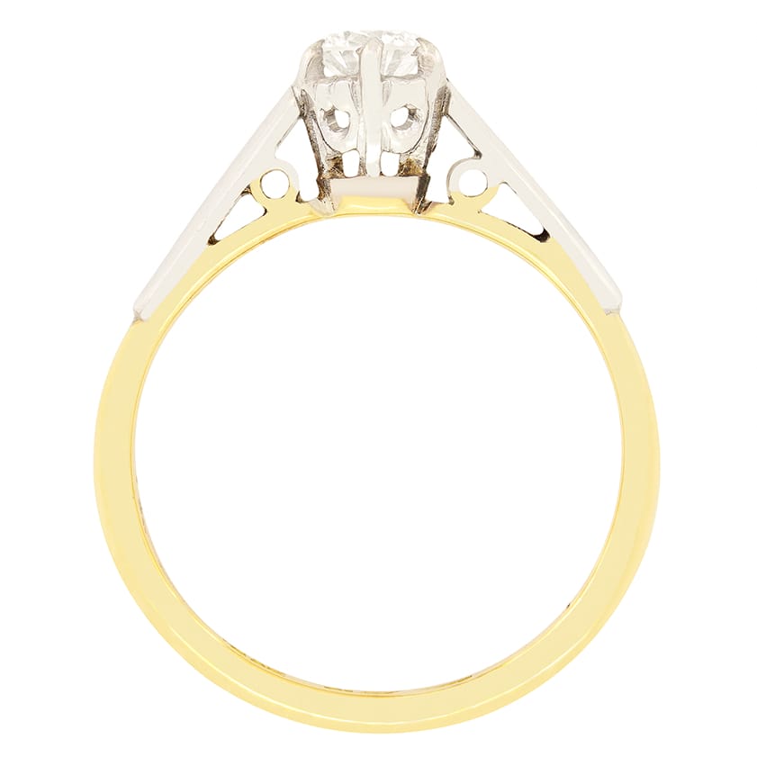 This sweet vintage solitaire ring features a single 0.35 carat, transitional cut diamond at its centre. Claw set into platinum the diamond has a colour of G and clarity of SI2. Tapering shoulders, also of platinum flow into a simple contrasting band of 18 carat yellow gold to complete this classic engagement ring.